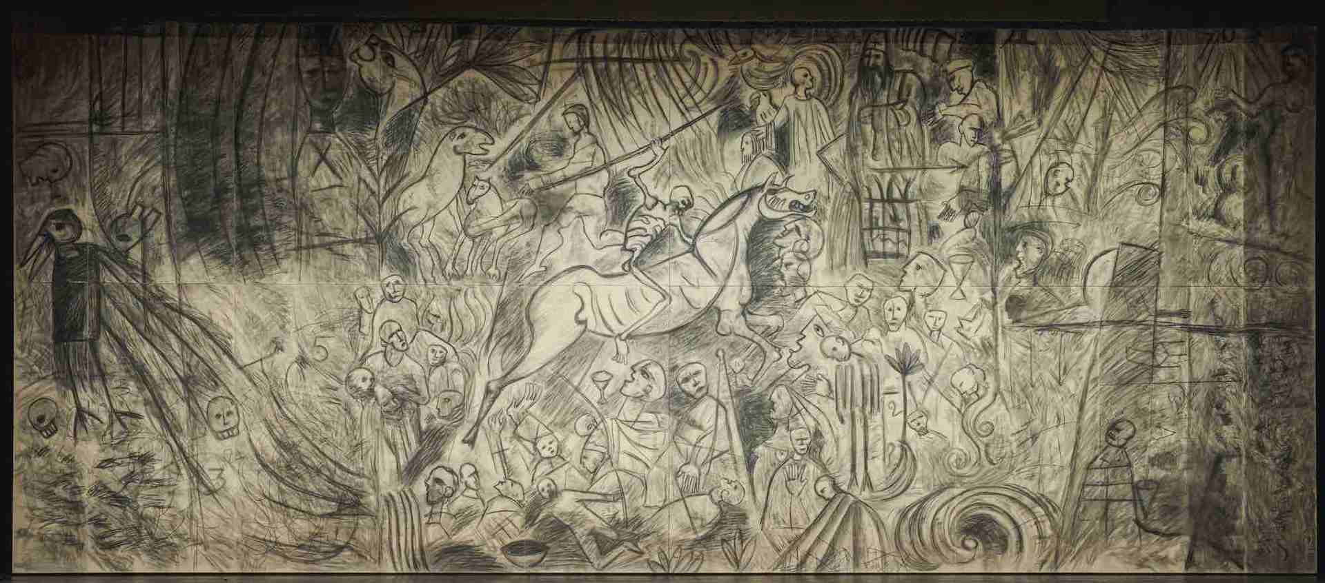 Quella che Paladino ha voluto creare è una scena apocalittica, rielaborata come un sipario di ferro per accompagnare lo spettatore nel clima oscuro di questo spettacolo. Non poteva che essere il maestro campano a sintonizzarsi con il «Macbeth» di Verdi, con le sue potenti, estreme sonorità che a tratti montano come un mare in tempesta e paiono sprofondarci nei gorghi di una furia catastrofica, come ben ci ricorda Risaliti. In questo sipario di 18 metri per 8, realizzato su legno stendendolo per terra nel suo studio a Paduli, l’artista ha usato carboncino, grandi pennelli e, date le dimensioni, ci ha camminato sopra quasi in trance muscolare, come uno sciamano alle prese con spettri e fantasmi, con le forze oscure del dentro e del fuori, con le Erinni e le divinità della guerra, con i mostri generati dalle ideologie e dalla tecnologia.