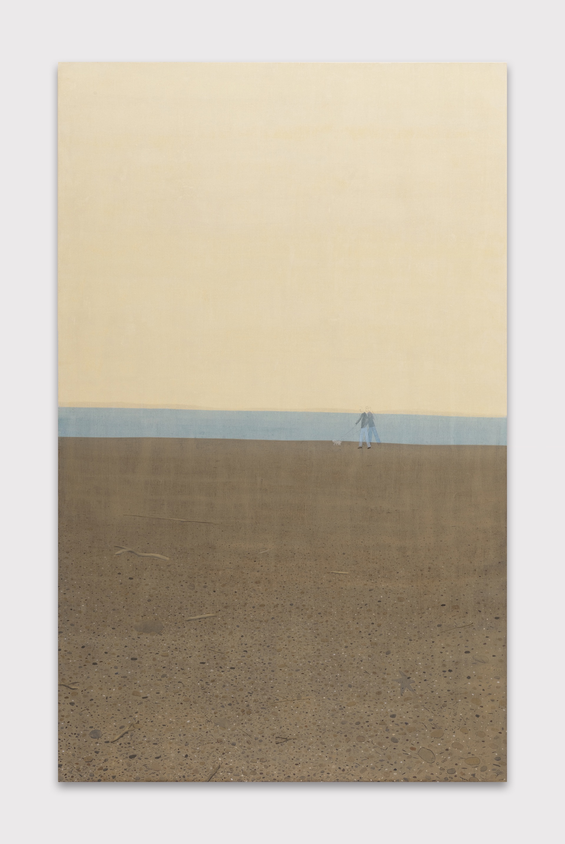 La memoria diventa quindi «soglia». Perché l’atto stesso del dipingere diventa «guardare e attendere». In «Planktos» (2025) – che dal greco significa «ciò che deriva o fluttua» – dettagli minuscoli come pietre, ghiaia, frammenti di materia emergono sulla sabbia. La costa diventa spazio che divide stati diversi – liquido e solido, percezione e memoria. Il significato resta sospeso, fluttuante, come la «materia» che dà il nome all’opera. E le figure isolate fungono da punti focali, perché anche quando inserite in contesti stratificati o sfocati, guidano lo sguardo e strutturano la percezione.
