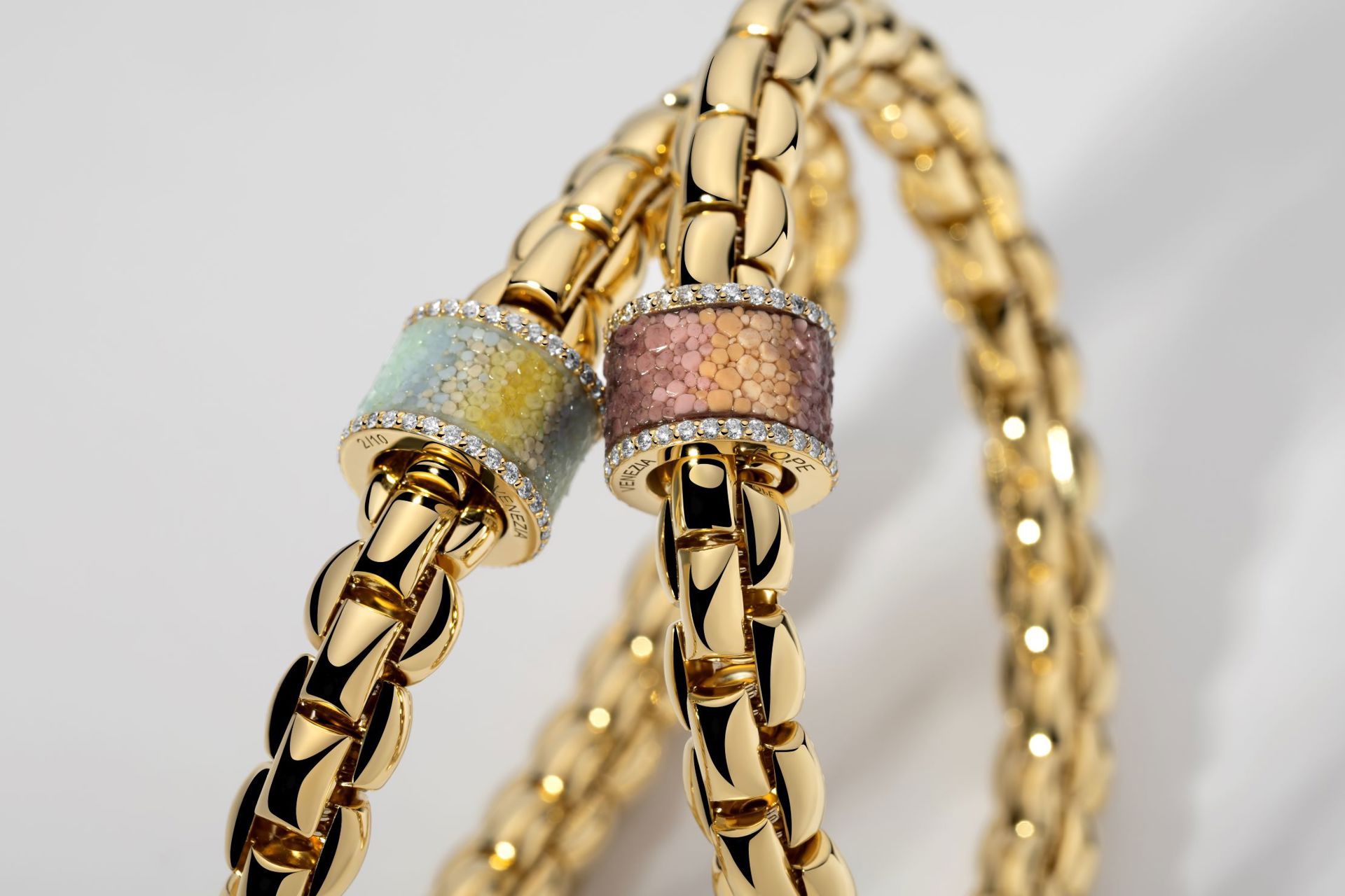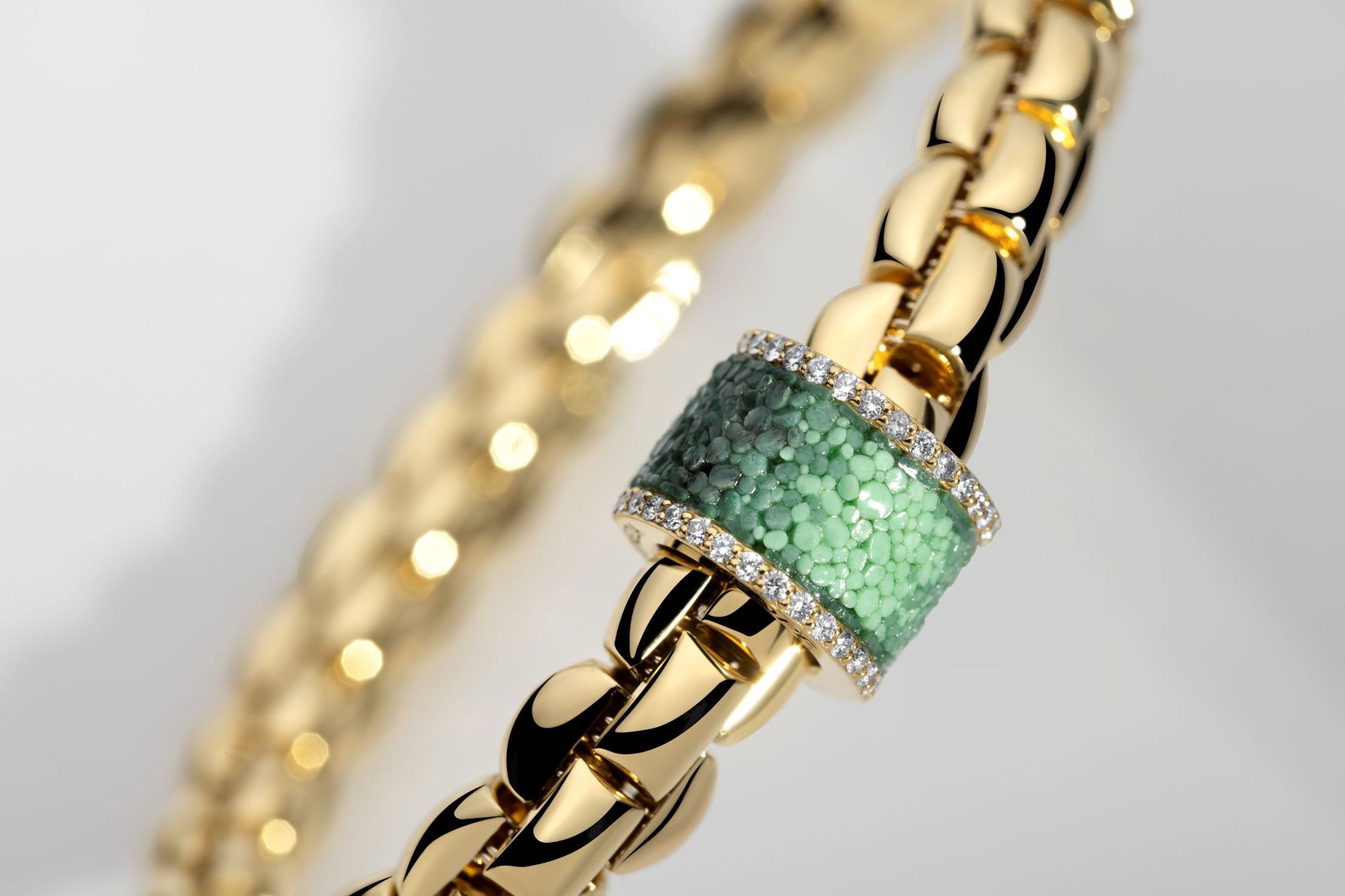 A dieci anni dall’apertura del primo negozio FOPE a Venezia, il brand vicentino celebra la città simbolo del suo territorio con Eka San Marco, l’edizione limitata in dieci pezzi numerati ispirata ai mosaici della Basilica di San Marco. Icona del marchio, Eka è stata la prima collezione declinata in versione Flex’it, il sistema che rende la maglia elastica grazie a minuscole molle in oro a 18 carati. Per celebrare lo speciale anniversario, il bracciale Eka è stato arricchito da un’esclusiva lavorazione artigianale realizzata dai maestri di Sicis, eccellenza italiana nella tecnica del mosaico e micromosaico. Messa a punto nel diciottesimo secolo, la tecnica del micromosaico consiste nell’incastonatura a mano di tessere di misura molto ridotta, anche inferiore al millimetro, in pasta vitrea fusa ad altissime temperature e filata a mano. La peculiarità di Eka San Marco è l’utilizzo di una pasta creata ad hoc, un mix di componenti minerali e di polveri ottenute dalla macinazione di pietre dure come lapis, tormalina, malachite e ametista in base alle sfumature desiderate. Il processo di lavorazione restituisce una serie di pezzi unici, che trasformano l’elemento decorativo del bracciale in una piccola opera d’arte e maestria artigiana.