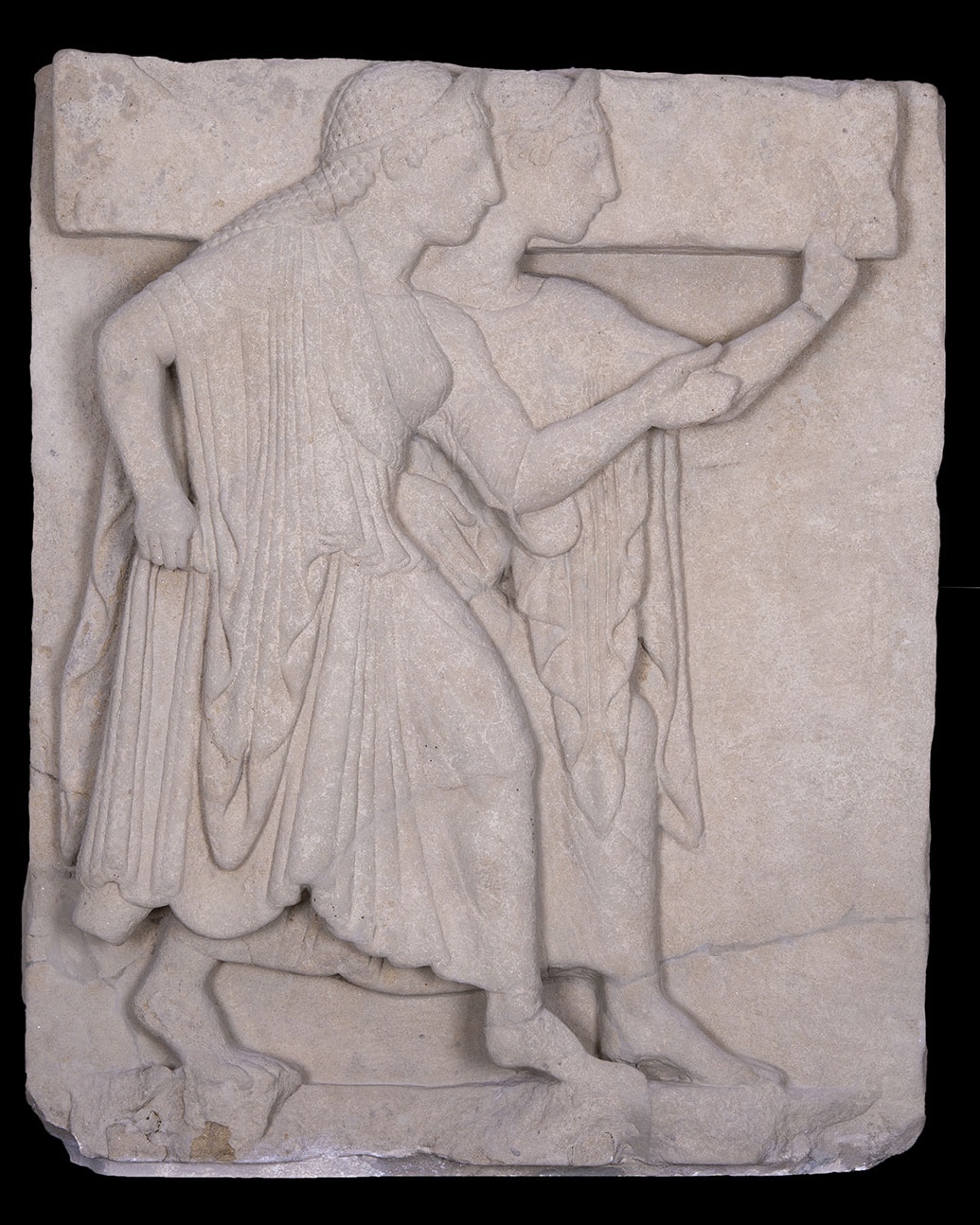 Metopa in pietra arenaria con coppia di fanciulle che sfilano in corteo danzando in onore di Hera, 500 a.C. Cortesia dei Parchi Archeologici di Paestum&Velia