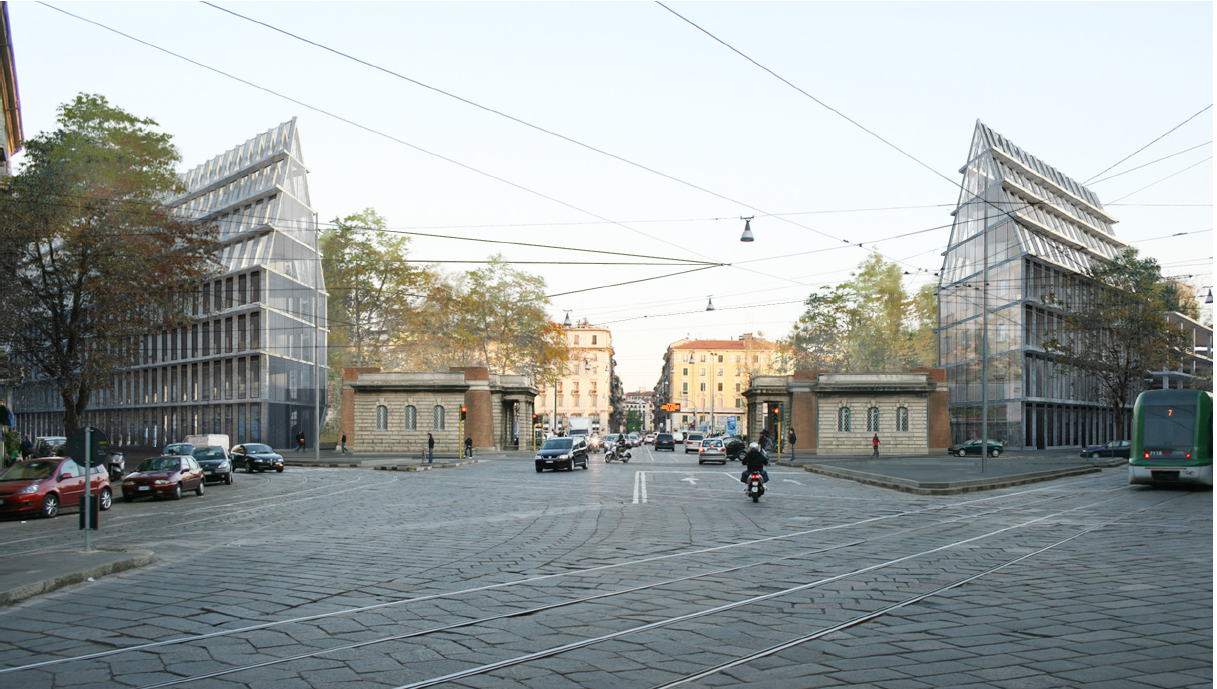 Rendering del Museo della Resistenza (a destra) a Porta Volta, progetto di Herzog & de Meuron, come il grande edificio sulla sinistra, sede della Fondazione Feltrinelli e di Microsoft House