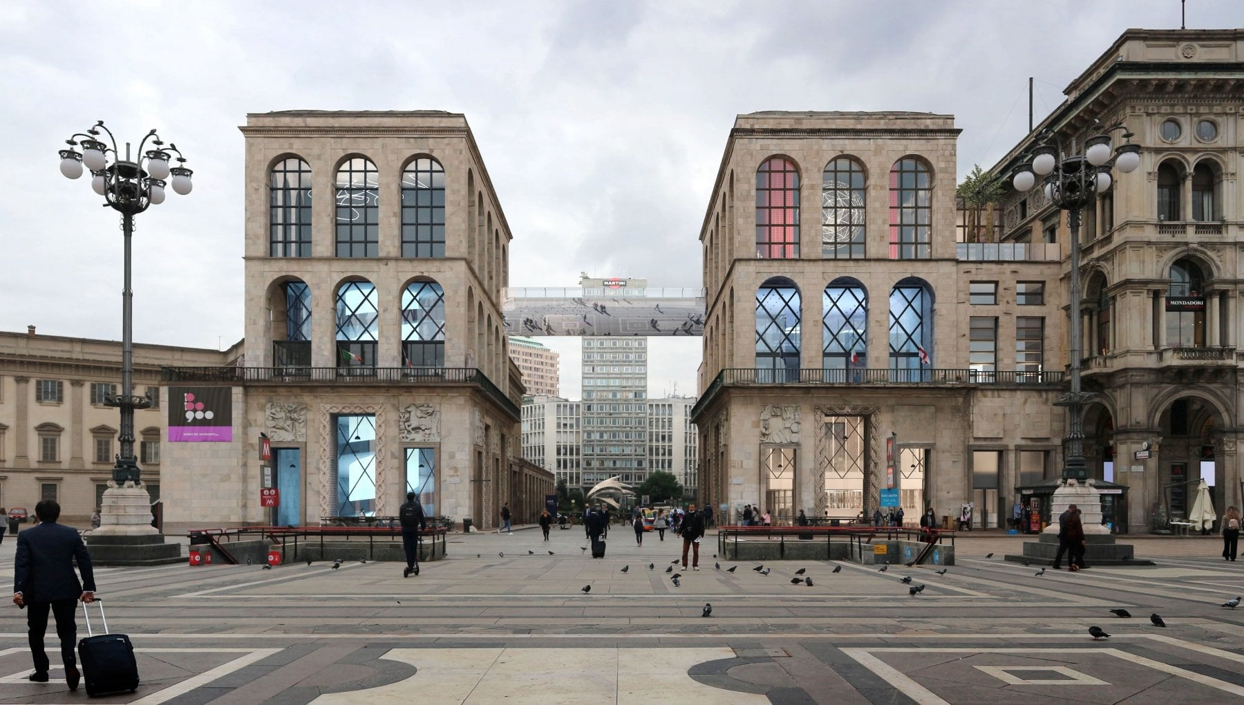 Il Museo del Novecento con il rendering del Secondo Arengario (a destra). Progetto originale dei due edifici, Portaluppi, Muzio, Galmarini, Magistretti, Griffini. Progetto attuale del team composto dagli architetti Sonia Calzoni (capogruppo), Pierluigi Nicolin, Ferdinando Aprile, Giuseppe Di Bari e Bruno Finzi
