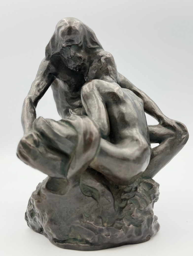 Alta 19,5 centimetri, la scultura rivela tutta la potenza emotiva e la profondità psicologica tipiche del linguaggio rodiniano. Le superfici, animate da una luce vibrante e da un movimento interno quasi liquido, sembrano vive. Il bronzo scuro, con la sua patina iridescente, amplifica il senso di tensione e fusione tra i corpi, tra la materia e l’anima.