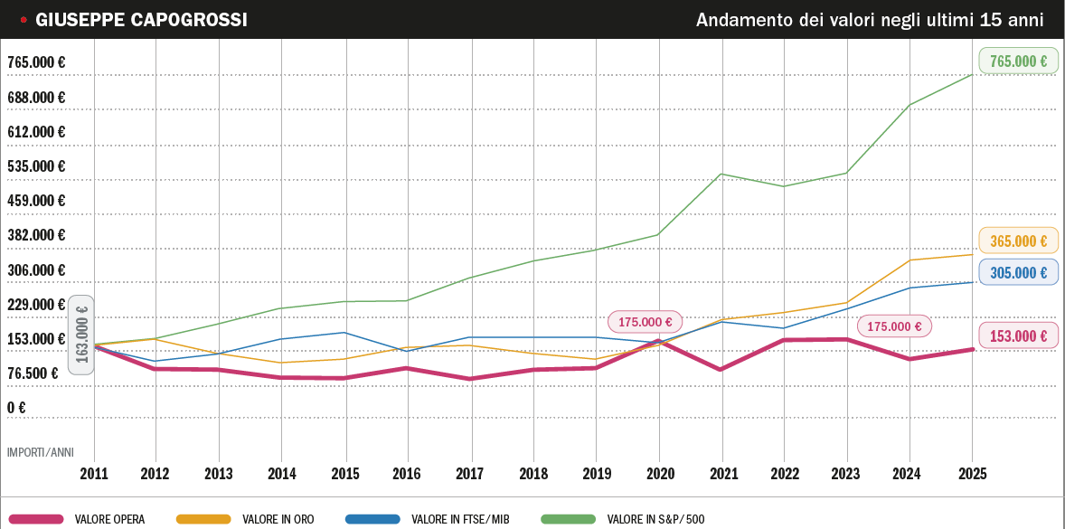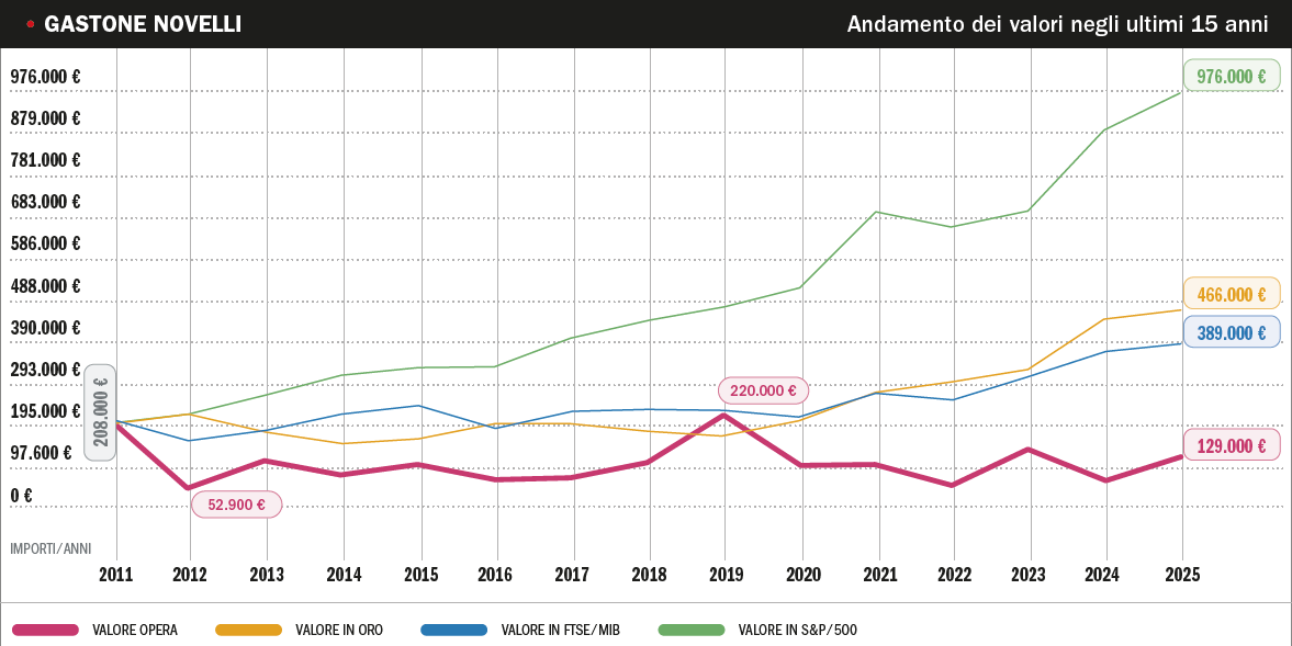 Attenzione. Gli indici mettono a confronto l’andamento degli artisti negli ultimi 15 anni rispetto a un particolare segmento del loro mercato (viene calcolata la media dei valori considerando i risultati delle case d’asta italiane e internazionali) con l’oro, la Borsa italiana (Ftse Mib) e la Borsa americana (Standard & Poor’s 500).