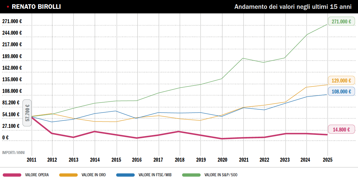 Attenzione. Gli indici mettono a confronto l’andamento degli artisti negli ultimi 15 anni rispetto a un particolare segmento del loro mercato (viene calcolata la media dei valori considerando i risultati delle case d’asta italiane e internazionali) con l’oro, la Borsa italiana (Ftse Mib) e la Borsa americana (Standard & Poor’s 500).