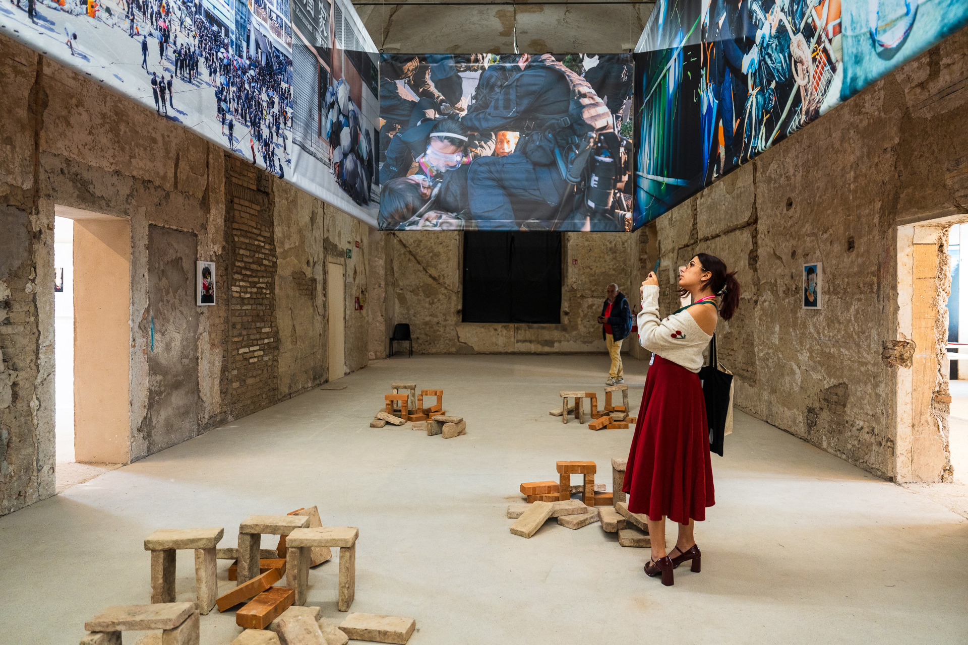 Per trasmettere questa eterogeneità di racconti e di voci non c’è location migliore dei Chiostri di San Pietro, che ogni anno, forse non a caso, diventano la casa di tematiche che risuonano con il senso precario delle sue sale espositive, dove tubi ed elementi strutturali rimangono a vista nell’allestimento, con quel suo essere eternamente «non finito». Questo luogo permette un dialogo aperto tra il concetto di fragilità, precarietà e cura, con quello di ruvidezza, libertà, spontaneità, e forza, e lo fa con installazioni immersive e potenti. Uno degli impianti espositivi più scenografici, giocato esclusivamente sulla percezione dell’immagine, è quello della mostra di Andy Sewell, «Slowly and then all at once», con cui l’autore vuole rendere percepibile la fisicità del potere, la collisione dei corpi delle autorità con quelli dei giovani che protestano per il cambiamento climatico. Sewell ricerca spasmodicamente di trasmettere la sensazione della tensione corporea con grandi pannelli (dittici o trittici) che sembrano essere il prolungamento della stessa immagine, ma non lo sono. Ogni pannello è a sé stante, ma uniti insieme creano una prospettiva che rende la mostra un’esperienza tridimensionale sulla fenomenologia del potere.