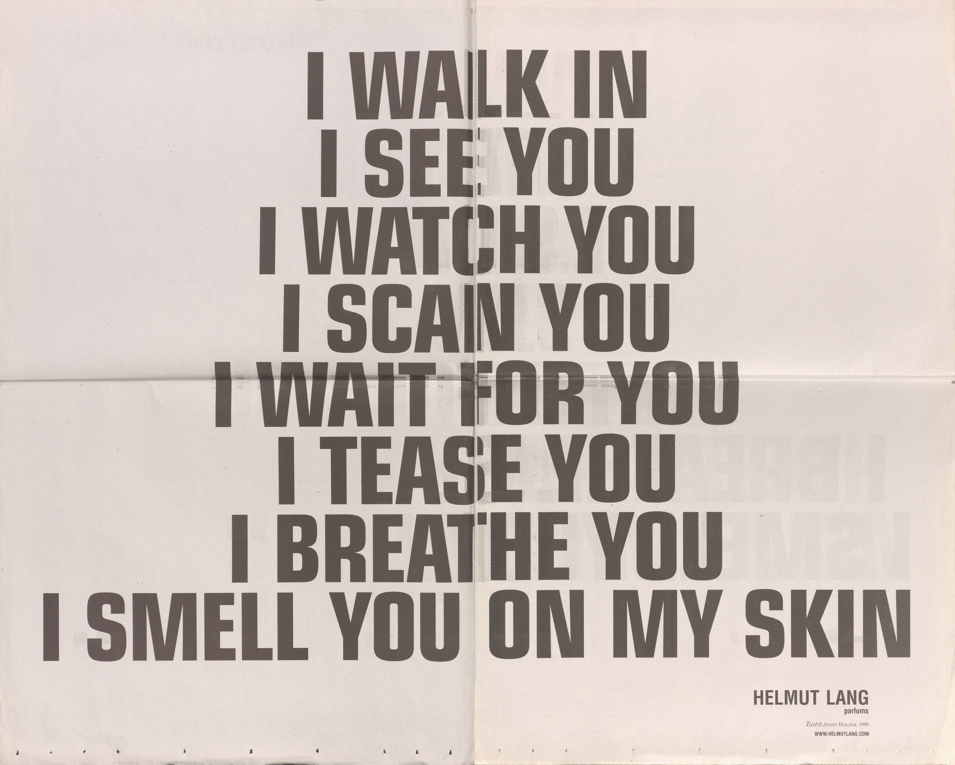 Il supplemento Helmut Lang Parfums da «The New York Times» con testo di Jenny Holzer (2001). MAK Helmut Lang Archive, LNI 572-2-3. Courtesy of hl-art