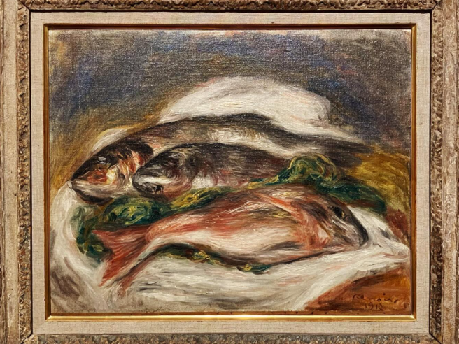 Il dipinto di Renoir rappresenta un esempio significativo della fase finale della sua carriera, nota come periodo di Cagnes-sur-Mer, durante il quale l’artista, nonostante le gravi limitazioni causate dall’artrite, continuò a dipingere sperimentando una resa più solida delle forme e tonalità luminose. In «Les Poissons», una semplice natura morta si trasforma in una composizione vibrante, ricca di luce e intensità cromatica.