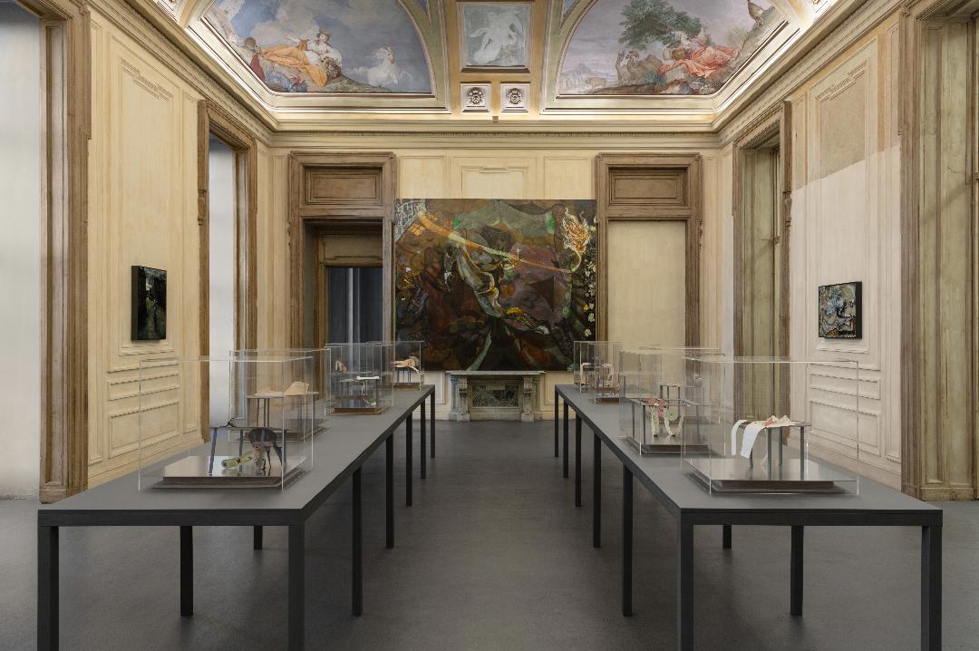 Nell’ambiente del piano superiore in cui gli adolescenti venivano rinchiusi — uno stanzone rettangolare, tinto di azzurro, con su un lato due livelli di celle a grate bianche ortogonali — Giovanni Chiamenti presenta nuove opere ispirate alla possibilità di un futuro mutamento evolutivo che vede l’adattamento di nuovi organismi a un ecosistema saturo di polimeri. Le creature ritratte dall’artista sono speculazioni fantastiche suggerite da un attento studio e da un costante confronto con esperti e scienziati. I grandi dipinti a tecnica mista della serie «Genomic Chimeras» e le sculture in alluminio di «Processed Archetypes» nascono da una ricerca sulla storia geologica della regione, in particolare sulla fauna marina che la abitava in tempi remoti, quando l’odierno Monferrato era coperto dal mare. Visitando le grotte di Bossea l’artista ha appreso che anche questo ambiente, a lungo considerato incontaminato, è stato raggiunto dalle microplastiche, portando i particolari organismi che lo abitano a una convivenza forzata con gli scarti prodotti dall’essere umano. Le figure nelle opere di Chiamenti non sono state immaginate per evasione dalla pressante questione ambientale, ma per ipotizzare su quali nuove strade potrebbe svilupparsi l’inarrestabile corso della vita.