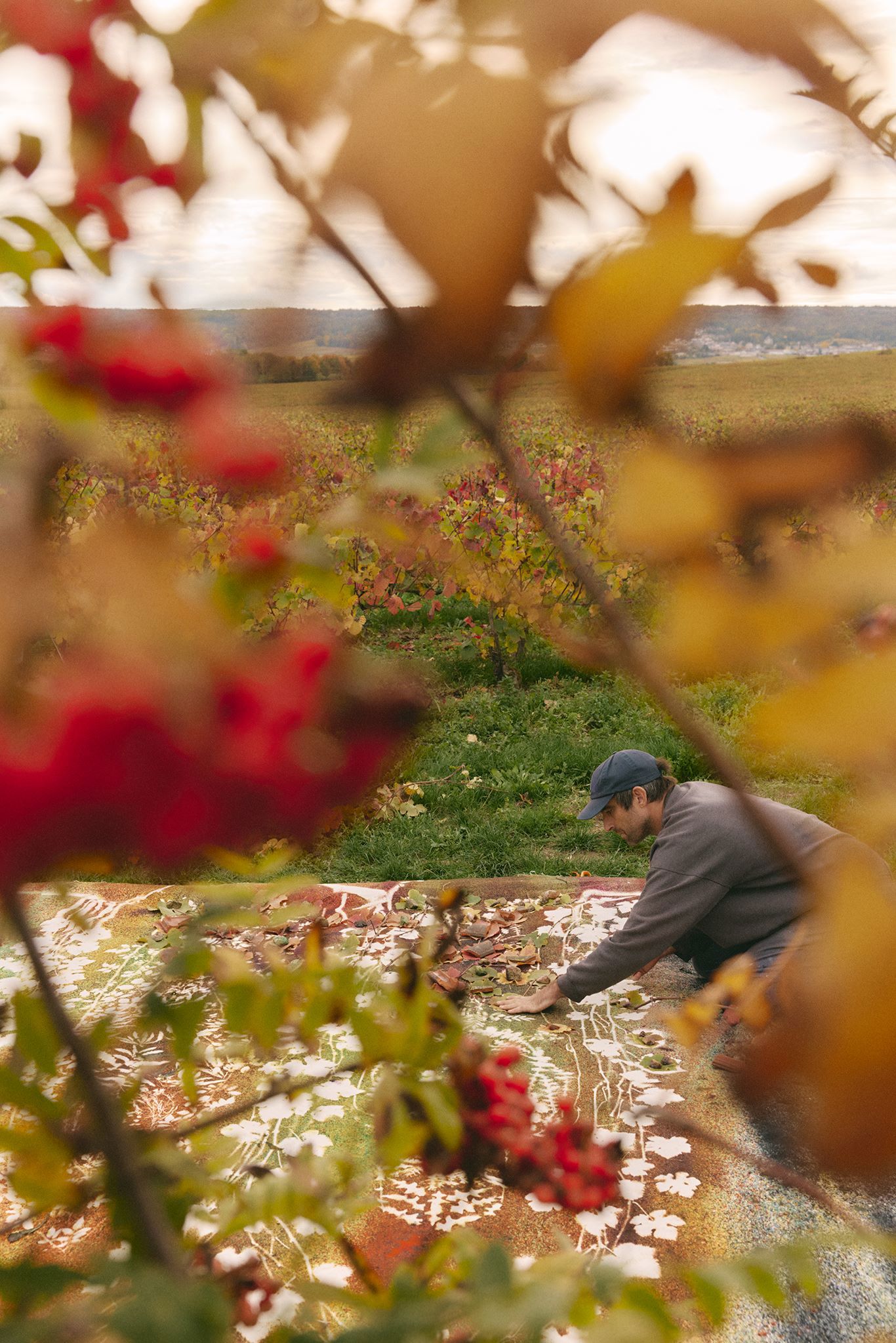 Taissy è un luogo particolare: un vigneto storico, ma anche un laboratorio di biodiversità. Ho raccolto sia elementi della vigna sia piante spontanee reintrodotte per rigenerare il suolo. L’opera è un ritratto botanico del luogo, un documento diretto della sua vitalità.