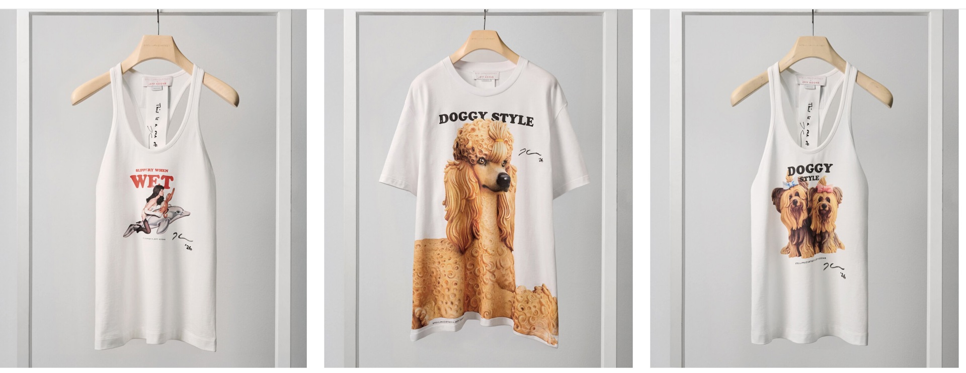 Sul piano materiale, la scelta dei tessuti e delle lavorazioni segue la stessa logica di coerenza. L’uso di materiali organici certificati e l’assenza di componenti di origine animale non funzionano come cornice etica separata, ma come parte integrante del progetto. La sostenibilità, in questo contesto, è una condizione strutturale: definisce il modo in cui i capi esistono, vengono prodotti e indossati.Slippery When Wet non concentra il senso in un gesto singolo, ma lo distribuisce nel tempo dell’uso, nella reiterazione del messaggio, nella familiarità che si crea tra corpo, immagine e testo. Indossare questi capi significa portare con sé una frase che vive nel rapporto quotidiano con la superficie del tessuto e con il movimento. Nel lavoro di Koons, oggetti pop, come giocattoli gonfiabili, souvenir, immagini commerciali, superfici lucide pensate per attrarre lo sguardo, vengono isolati e resi iper-visibili, trasformandosi in superfici di desiderio. Nel lavoro di McCartney, il corpo non è mai idealizzato né messo in scena, ma pensato come corpo in movimento, reale, quotidiano, a cui l’abito aderisce senza costringerlo, accompagnandone i gesti e i ritmi. Slippery When Wet è il punto di convergenza tra questi due approcci: una linea che gioca sulla soglia tra sguardo e uso, dove immagine, testo e materia non simboleggiano il desiderio, ma lo rendono praticabile, instabile, continuamente negoziabile nella vita di tutti i giorni.