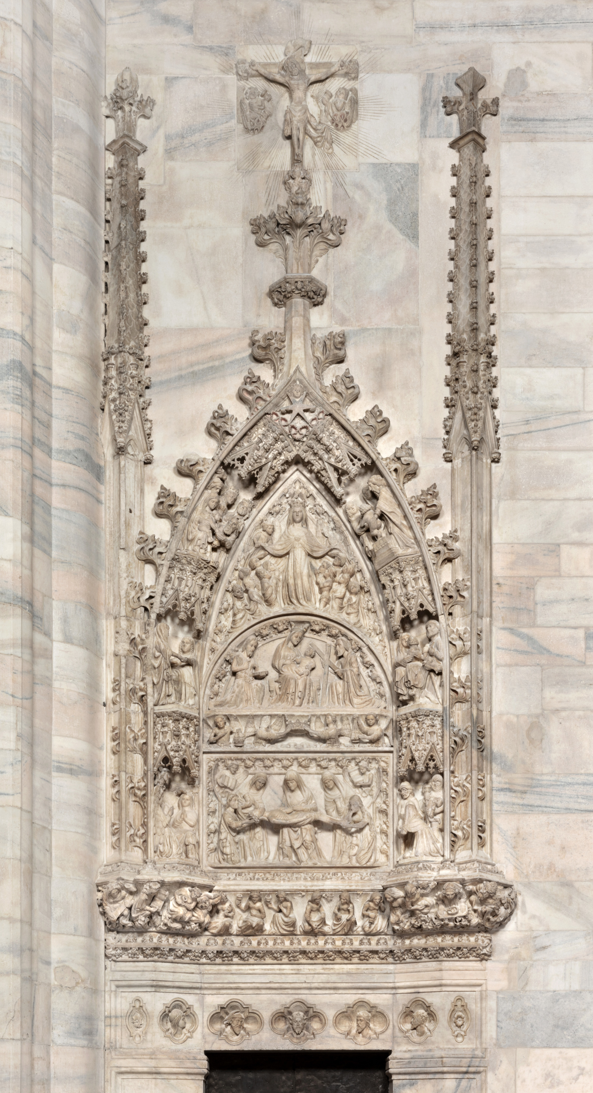 C’era oro, oro ovunque sul magnifico altorilievo che sovrasta il portale della Sacrestia Capitolare del Duomo di Milano che, rivolta a meridione, era riservata all’arcivescovo e ai canonici del Duomo. La sua porta d’accesso era allora in dialogo visivo con quella, dirimpetto, della sacrestia «feriale» (detta Aquilonare perché volta ad Aquilone, il vento del Nord), dal momento che non era ancora stato costruito il tornacoro voluto nel Seicento da Federico Borromeo, che oggi occlude la visuale, ed entrambe quelle meravigliose sculture a parete erano pensate dai loro ideatori come grandiose, sfavillanti oreficerie. Le due sacrestie furono le prime parti del Duomo a essere edificate subito dopo la fondazione (la prima pietra è del 1386), nel gran vuoto luminoso che doveva essere allora l’abside del maestoso edificio voluto da Gian Galeazzo Visconti come «chiesa dei milanesi»: non di proprietà statale né di proprietà ecclesiastica, bensì della Fabbrica del Duomo, cui tutto faceva capo.
