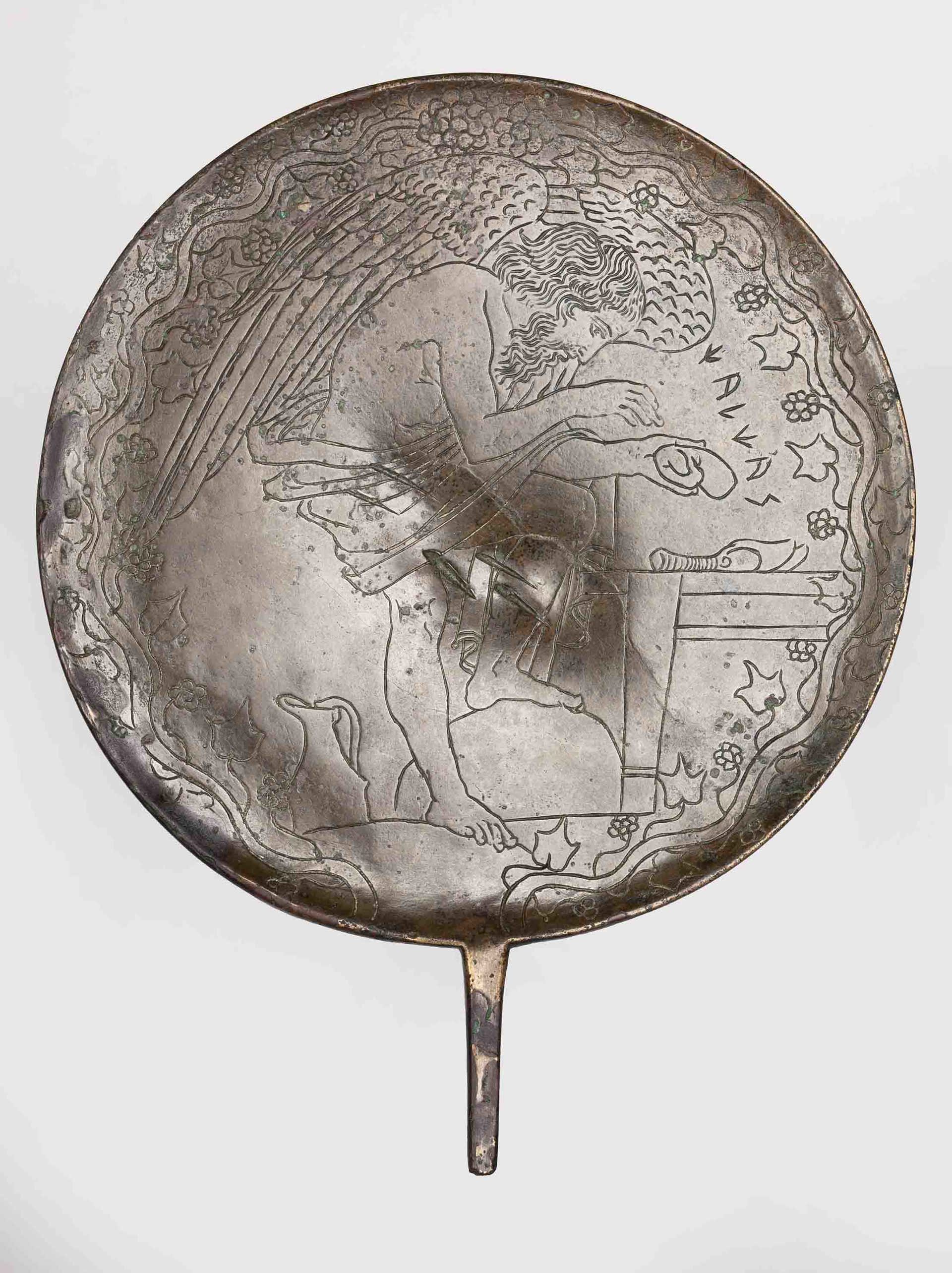 Specchio inciso in bronzo raffigurante un aruspice etrusco in atto di esaminare il fegato di una pecora, fine V sec. a.C.