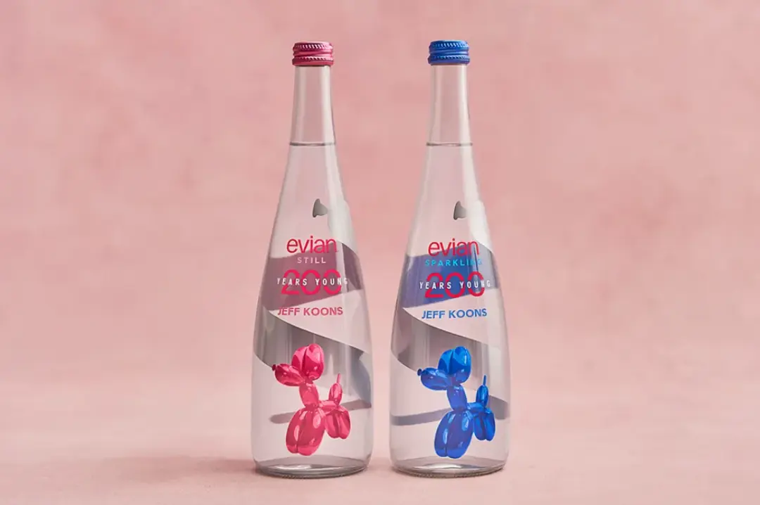 In edizione limitata, le bottiglie in vetro del marchio francese sono decorate con due versioni del celebre «Balloon Dog» dell’artista americano: rosa per l’acqua naturale e blu per quella frizzante