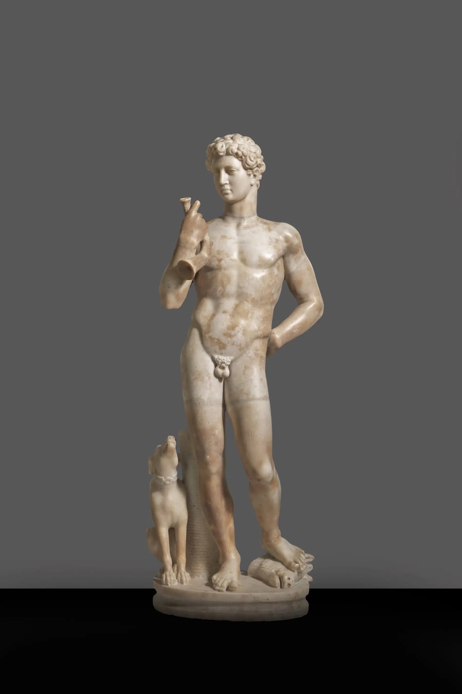 La piccola scultura dell’Eroe nudo con corno, databile tra I e II secolo d.C., riprende nella parte antica (corrispondente al torso e alla parte superiore delle gambe) il modello di Eracle concepito da Policleto nella seconda metà del V secolo a.C. In epoca moderna la statua è stata integrata con la testa, le braccia e la base, dando vita alla figura di un giovane eroe cacciatore, che qualcuno accosta alla rappresentazione di Meleagro accompagnato dal suo cane.