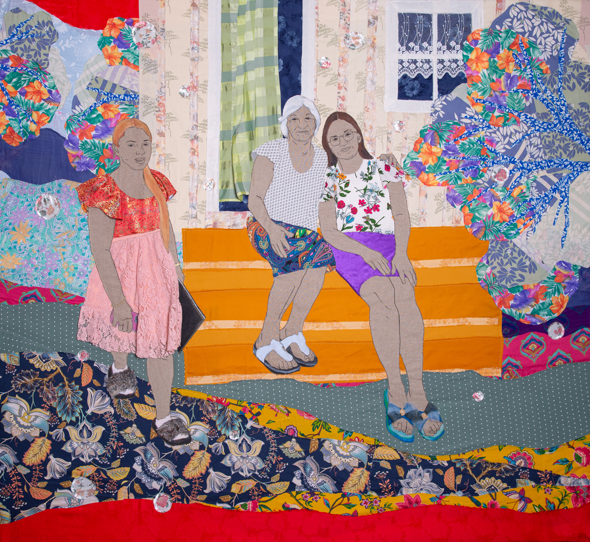Il tessuto è portatore di un significato profondo, è un veicolo di emozione ed energia. Le storie che raccontiamo sono letteralmente intessute nella materia. Ogni filo cuce insieme vite individuali, storie private e mette in condivisione traumi. Il filo stesso diviene una sorta di connettore, una forma di terapia. Io lavoro con tre donne nel mio studio. Inizio ritagliando figure da fotografie, le vesto e, quando i personaggi sono completi, inizio a costruire lo sfondo, un processo regolato, un lento, meditato metodo di costruire in due dimensioni. Ho un forte attaccamento alle figure e alle storie che mi sono state raccontate, e prendo qualcosa da ciascuna. Mi colpisce quanto simili siano le nostre vite. Siamo guidati da valori condivisi, da un senso di cura per il futuro e per le generazioni che verranno dopo di noi. L’identità è qualcosa di profondamente radicato. Queste donne ricordano esattamente da dove vengono: ecco perché cerco di ritrarle con grande sensibilità, come se le illustrassi, come se avessi scelto di mostrarle. Ho scelto citazioni della poesia di Papusza (poetessa e cantante polacca di etnia rom) avendo loro in mente. Come loro, lei visse una vita in movimento e, a un certo punto, anche lei dovette fermarsi. Io vivo sulle montagne, i fratelli di mio nonno lavoravano con i cavalli e i cavalli della giostra hanno un particolare significato per me. In quest’opera si muovono nello spazio non più come giocattoli da giostra, ma come simboli e rappresentano quell’idea di libertà che è centrale anche nella vita dei Rom: il desiderio di decidere per sé stessi, di tracciare il proprio percorso.