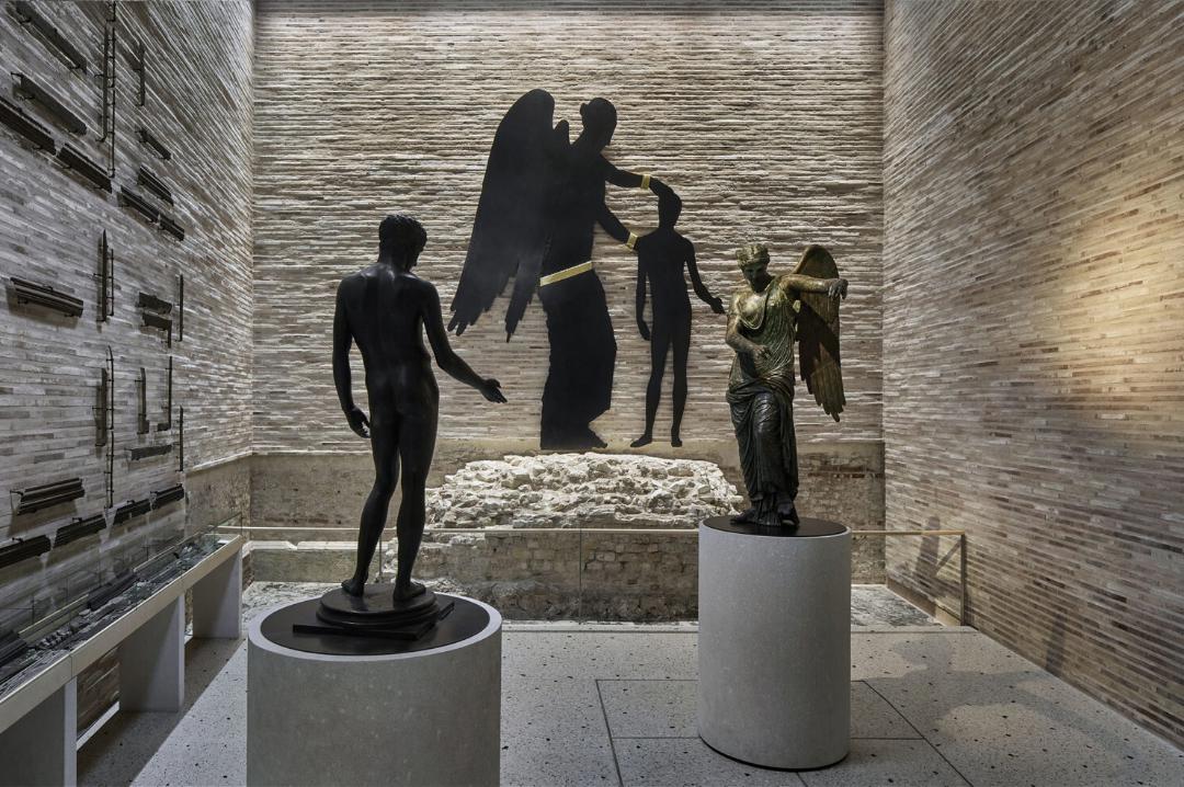 Nel Capitolium il nuovo allestimento, firmato Vezzoli e Grau, della figura bronzea in dialogo con la scultura rinvenuta nella città marchigiana anticipa le celebrazioni dei 200 anni del suo ritrovamento con le Teste d’imperatore, tre delle quali in trasferta all’Archeologico di Firenze