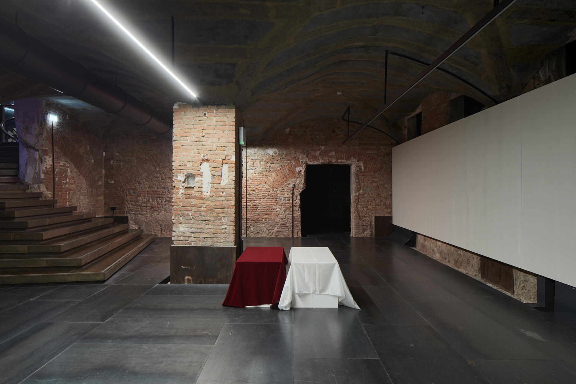 Curata da Tommaso Pasquali e Simone Menegoi (che di Smith ha cocurato nel 2014 la prima personale in un’istituzione italiana, alla Triennale di Milano), la mostra è ospitata nei cinquecenteschi sotterranei del Palazzo e, come per tutti i progetti espositivi di Smith, è stata appositamente pensata per lo spazio, con lo spazio e nello spazio: presenta nuove produzioni realizzate in loco, scandite a creare un rapporto simbiotico con le sale attraverso un attento controllo delle condizioni di illuminazione.