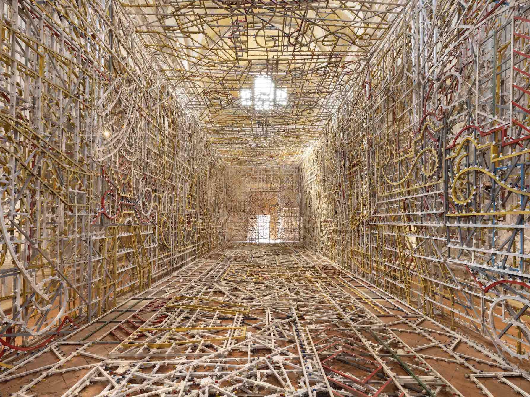 Leggi i suoi articoliNella Chiesa di San Carlo a Cremona si avverte lo stesso silenzio che ci sarebbe se non fosse sconsacrata. L’unico rumore insolito è uno sporadico crepitio, come di innocui petardi: il suono delle lampadine che scoppiano sotto i passi dei visitatori sovrappensiero, impegnati ad attraversare con cautela «100 giorni», l’opera site specific di Massimo Bartolini visitabile fino al 16 gennaio. Gli scoppi non suscitano reazioni dai custodi: probabilmente hanno messo in conto qualche danno, o forse fanno parte del lavoro stesso, che consiste in una gabbia monumentale (sei metri di altezza, sei di larghezza, ventuno di lunghezza) le cui pareti sono reticoli di luminarie festive siciliane spente. Giunti da Messina (con difficoltà, ammette l’artista), i telai di legno bianchi, gialli e rossi con relative lampadine colorate si stratificano su ogni faccia del volume, anche sul pavimento. Ne risulta un’architettura dentro l’architettura, percorribile lungo uno stretto corridoio esterno o attraverso un intricato percorso interno tra i telai, condannando inevitabilmente alcune lampadine a soccombere sotto passi falsi.