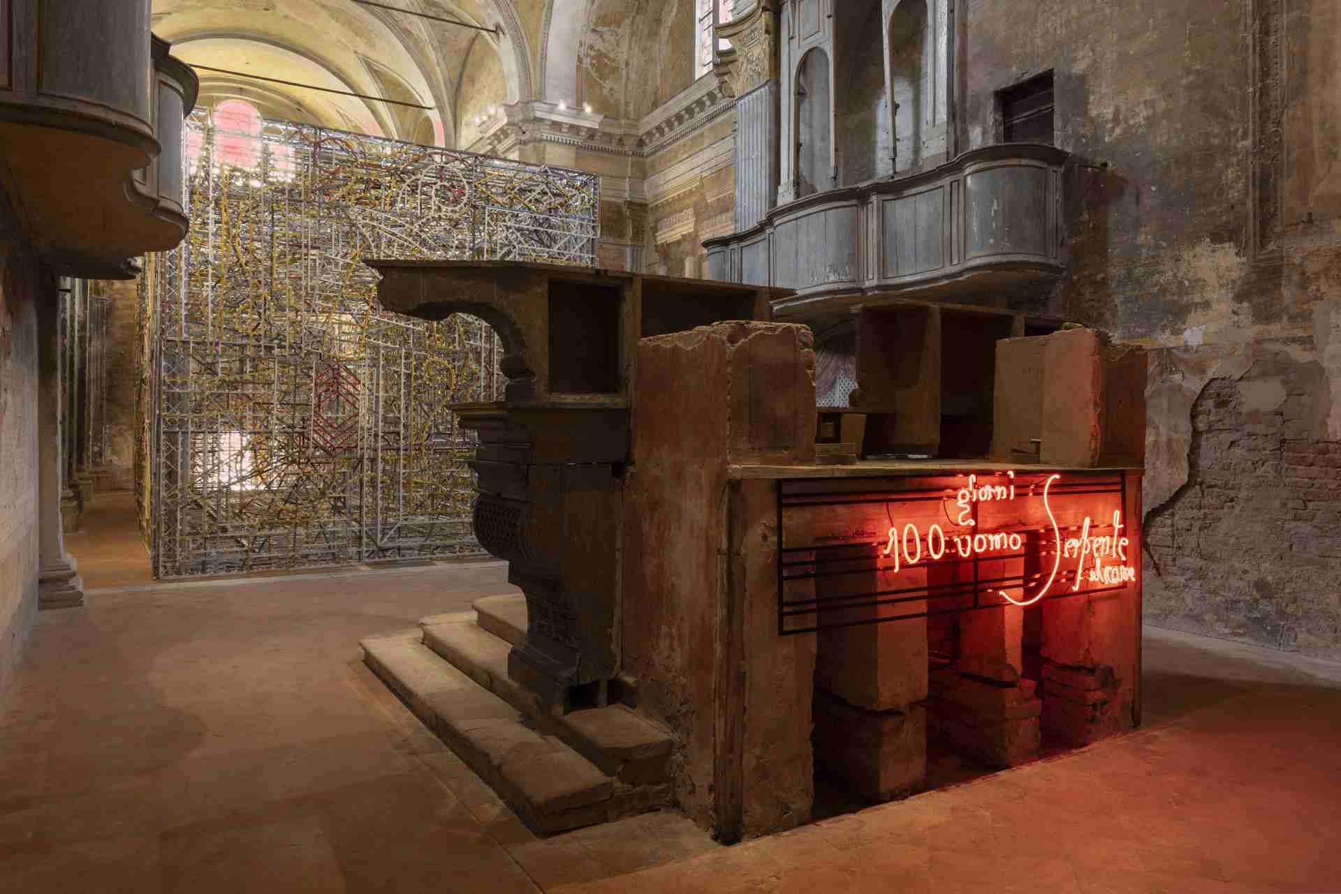 Ma questa è solo l’introduzione. Superata la navata centrale, invasa dal reticolato policromo, si raggiunge l’abside, dove un bagliore rosso invita ad aggirare l’altare. Qui, di fronte al coro, compare l’altra metà dell’opera: un neon rosso che recita, in calligrafia incerta, «giorni 100 uomo Serpente il cane», replica di graffiti anonimi scelti dall’artista nel Museo delle Prigioni di Pizzighettone, carcere attivo dal 1785 al 1954.