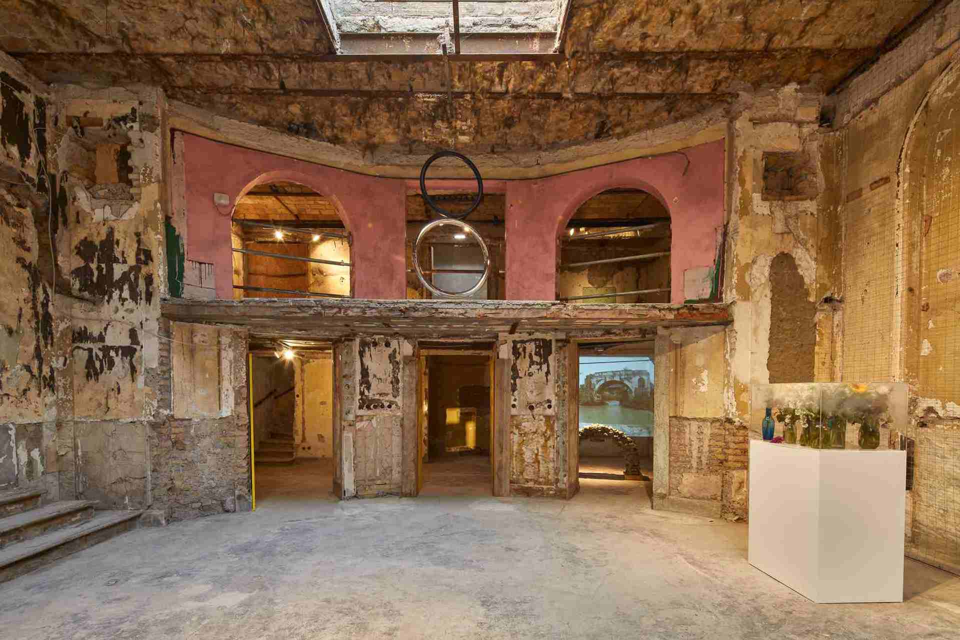 I lavori, alcuni storici, altri recenti e, tra di essi, alcuni realizzati in situ, sono allestiti in uno spazio abbandonato da trent’anni, che nel 1911 aveva ospitato una galleria privata dal mercante e collezionista Ludovico Spiridon, per poi, negli anni Ottanta, divenire sede del club La Cage aux folles. Inaccessibili e in rovina, gli ambienti si presentano al pubblico (numeroso in questi ultimi giorni) come inusuale spazio espositivo, in cui la memoria e il futuro di un edificio si toccano per un brevissimo istante. Commenta Tristan Weddigen, direttore della Bibliotheca Hertziana: «Come istituto di ricerca di storia dell’arte, sentiamo la responsabilità di documentare e preservare la memoria di uno spazio culturale prima di destinarlo alle nostre attività scientifiche. Poiché la Bibliotheca Hertziana sostiene anche lo studio dell’arte contemporanea, abbiamo adattato la metodologia di conseguenza. Con questa mostra mettiamo in scena una forma di rievocazione critica di quell’edificio: presentando arte contemporanea tra le rovine di una galleria storicista, invitiamo il pubblico a vivere la storia delle condizioni estetiche e istituzionali dell’arte, e al tempo stesso a creare una memoria collettiva di un luogo che tutti vedremo per la prima, e ultima, volta».