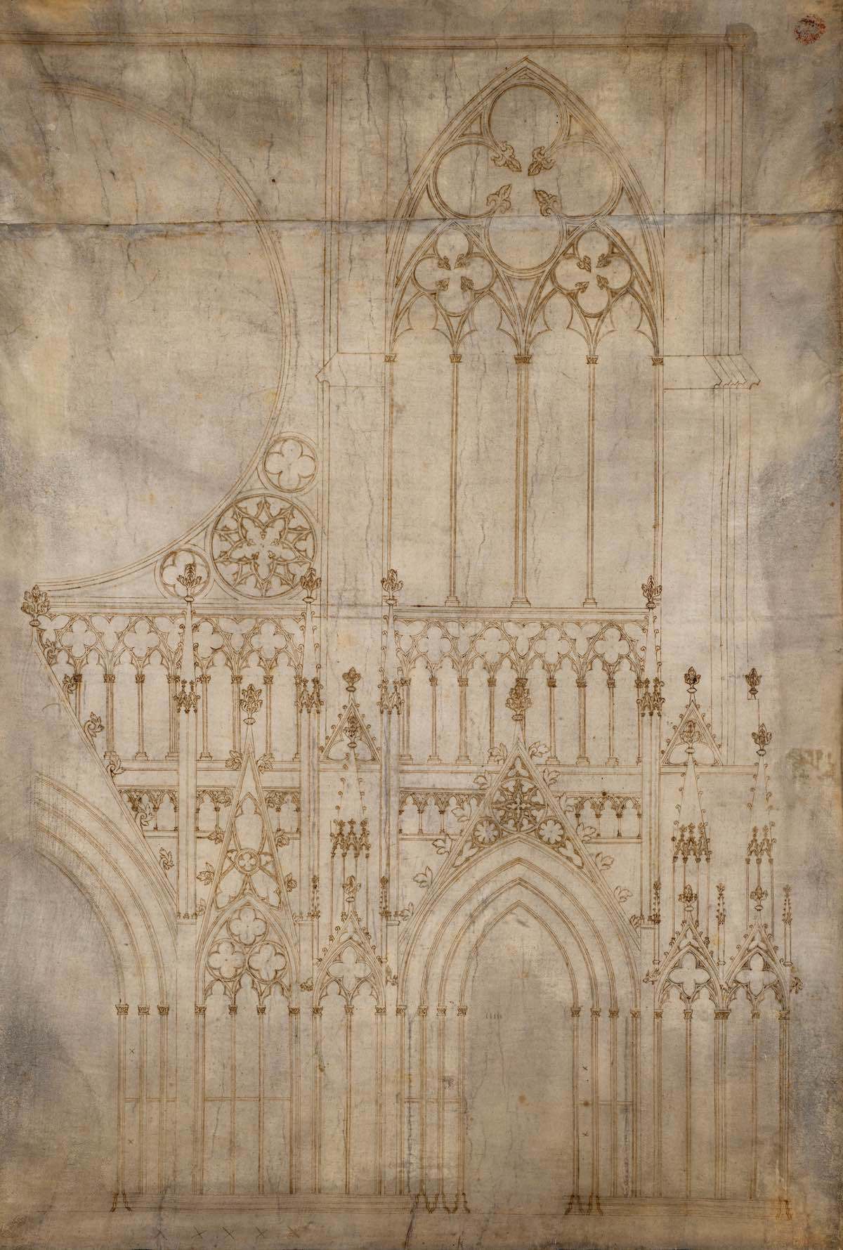 Come accennato, la sopravvivenza è maggiore laddove esistevano enti organizzati che si sono assunti questo compito (spesso fino a oggi: la Fondation de l’Oeuvre Notre Dame di Strasburgo, ad esempio, celebra quest’anno il suo 800mo anniversario!). Ovviamente altri fattori hanno influenzato la sopravvivenza dei disegni. L’archivio della cattedrale di Colonia, ad esempio, andò in gran parte perduto dopo l’invasione della città da parte delle truppe rivoluzionarie francesi nel 1794, mentre la maggior parte dei disegni inglesi fu probabilmente vittima della distruzione delle proprietà ecclesiastiche seguita alla frattura con la Chiesa Cattolica voluta da Enrico VIII nel 1534. A queste calamità si possono aggiungere anche perdite dovute all’uso (danni ed esposizione alla luce), alle condizioni climatiche (temperatura e umidità) e a improprie condizioni di conservazione. Inoltre credo che i disegni siano stati spesso conservati in modo selettivo. La maggior parte di schizzi, progetti e modelli veniva danneggiata durante l’uso, scartata o riciclata (lo vediamo abbastanza spesso con i disegni su pergamena, in cui l’inchiostro veniva lavato o raschiato via per realizzare nuovi disegni).