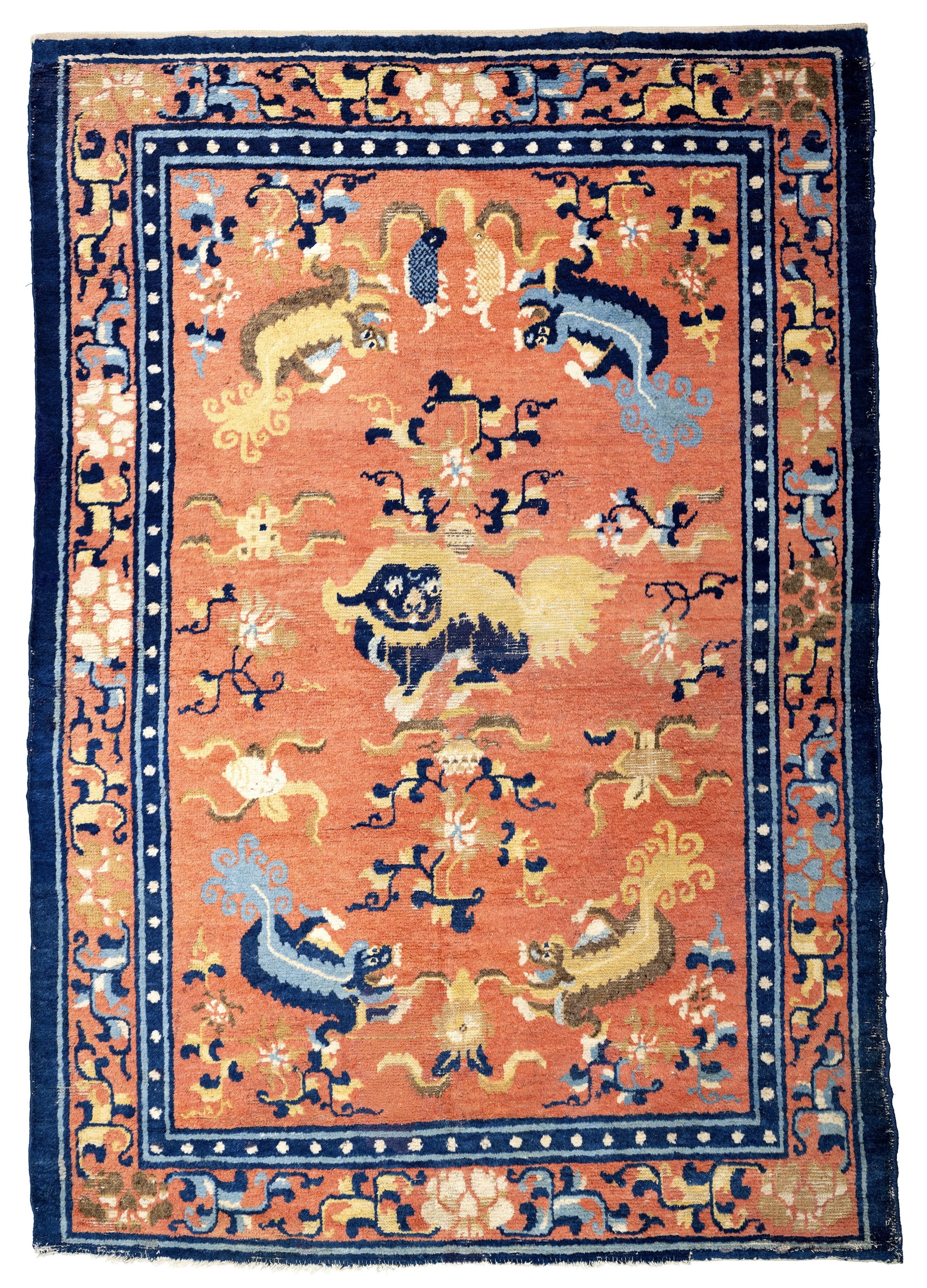 Resi con una «tavolozza» dominata dal giallo e dal blu nelle loro diverse sfumature (unica e rara eccezione il rosa pesca), in questi tappeti di pregiatissima fattura s’inseguono simboli e figure come il dragone, grande e terrifica «serpe» tradotta però in un segno sinuoso di grande eleganza; fiori di loto stilizzati; medaglioni dalle valenze filosofiche; croci uncinate, poi rese tristemente famose dal nazismo ma presenti qui nella loro simbologia solare originaria, portatrice di prosperità, e pipistrelli (tradotti in «sigle» concise ed efficaci) che in Cina sono considerati animali benevoli, portatori di felicità e di longevità. Ci sono poi crisantemi stilizzati, là simbolo di pace, con i loro petali arricciati su uno sfondo geometrico, come nel tappeto in mostra proveniente da Yarkant, città-oasi dello Xinjiang un tempo molto fiorente, che nell’alta bordura mostra il motivo mare-montagna-cielo, e ci sono l’unicorno, simbolo di lunga vita; la peonia, con i suoi petali carnosi, segno di nobiltà; la grassa carpa, che allude alla perseveranza; il cane leone cinese, legato al pensiero buddhista, che quando è realizzato in pietra è posto, a coppie, a minacciosa guardia dei palazzi e delle tombe imperiali, con un ruolo apotropaico di difesa dal male. Una vera «foresta di simboli», per parafrasare Baudelaire, nutrita dei principi del Buddhismo e del Taoismo, il cui messaggio è qui potenziato da un percorso sensoriale che include oggetti, parole tratte dal Taoismo scritte su fogli sospesi a telai di bambù, e profumi creati appositamente per questa mostra che evocano i fiori della tradizione cinese.