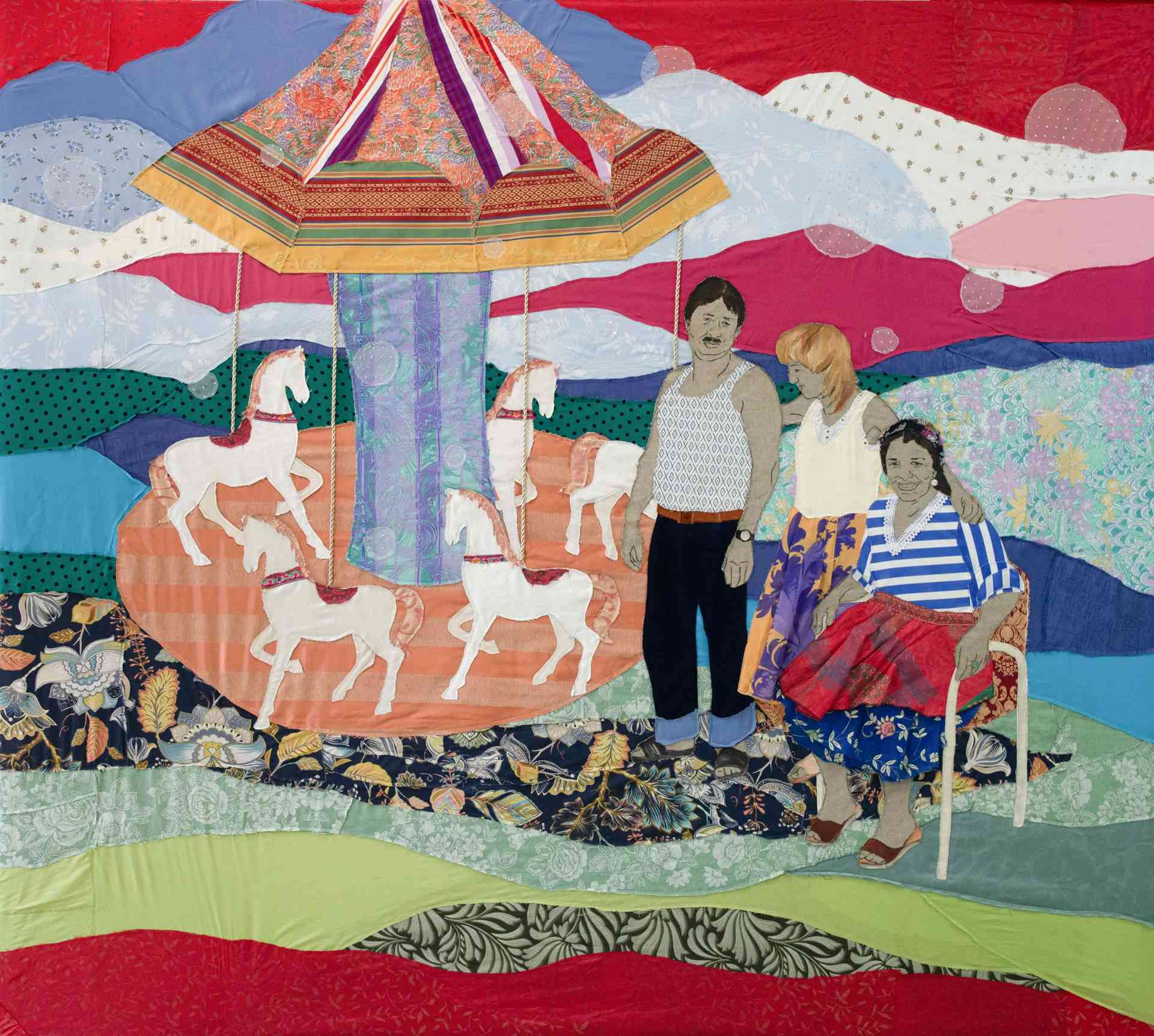 Al centro dell’allestimento reggiano campeggia una grande giostra ricoperta da stoffe multicolori, sulle quali l’artista ha cucito scene di vita quotidiana: famiglie riunite, bambini che giocano, donne che chiacchierano, uomini che aggiustano qualcosa o semplicemente si riposano. Non c’è retorica nella rappresentazione, né idealizzazione: è la vita stessa, quella che pulsa nei cortili, nei campi, nei caravan, quella che resiste, che si reinventa. Sulle fasce superiori dell’opera, come in un fregio antico, scorrono parole e versi, tra cui quelli della poetessa e cantante Papusza, figura leggendaria della cultura rom. È da un suo verso che Mirga-Tas prende il titolo della mostra: «Il Grande Carro predirà il futuro dei Rom».