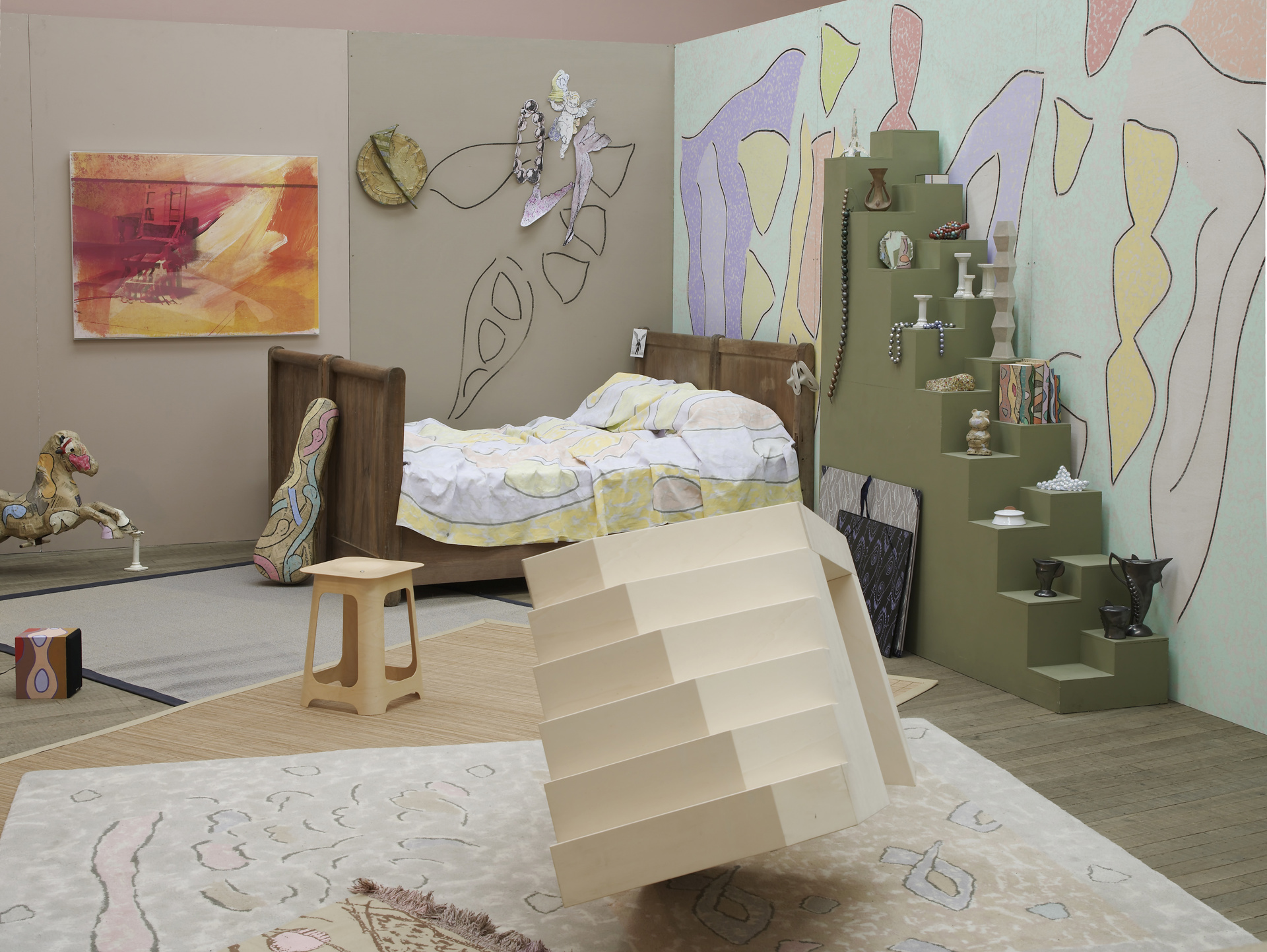 Un dialogo in cui subito entra, però, una terza figura, chiamata in causa dall’opera di Marc Camille Chaimowicz (Parigi, 1947-Londra, 2024; padre polacco, madre francese, cresciuto e formato a Londra, i cui interni sono presenti dagli anni Ottanta in importanti musei): la sua «stanza» (2003-14) è infatti intitolata a «Jean Cocteau» (Francia, 1889-1963; poeta, drammaturgo, saggista, disegnatore e molto altro, compagno di strada di Guillaume Apollinaire e di Max Jacob, di Picasso e di Modigliani), ed è quindi proprio quella di Cocteau la terza voce di questa conversazione attraverso il tempo, mentre la seconda è, ovviamente, quella di Dozie Kanu (Houston, 1993; artista nigeriano-americano di stanza in Portogallo, che si muove sul crinale sempre più sottile tra arte e design): la sua installazione, realizzata espressamente per questa mostra, entra in risonanza con quella di Chaimowicz e, sommata all’evocazione di Jean Cocteau, diventa, per così dire, l’ultima erede di questa genealogia a tre.