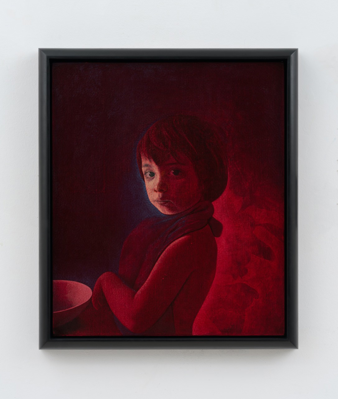 Ancora pittura, ma di segno diverso, nella mostra «Black Milk» di Lewis Hammond, curata da Chiara Nuzzi, che al piano terra ha riunito una ventina di dipinti recentissimi realizzati dall’artista tra il 2024 e il 2025 espressamente per questa mostra: in grande prevalenza, notturni dai freddi colori bluastri che sembrano rinviare alle angosciose atmosfere del «periodo blu» di Picasso. Incarnati lividi, figure più che inquietanti appena fuori dalla porta di casa (ma sotto un cielo di stelle da chiesa gotica), neonati addormentati, inermi e vulnerabili, su cui sembra incombere un pericolo. Tutto, nei dipinti di Hammond, trasuda inquietudine, ansia, smarrimento: sensazioni, private e collettive, d’impotenza di fronte al nostro mondo, e sembra voler rispondere (ma con altre domande) a domande come «in che cosa riponiamo speranza, oggi?», ed esiste ancora una fede in qualche entità spirituale, di qualunque natura essa sia?