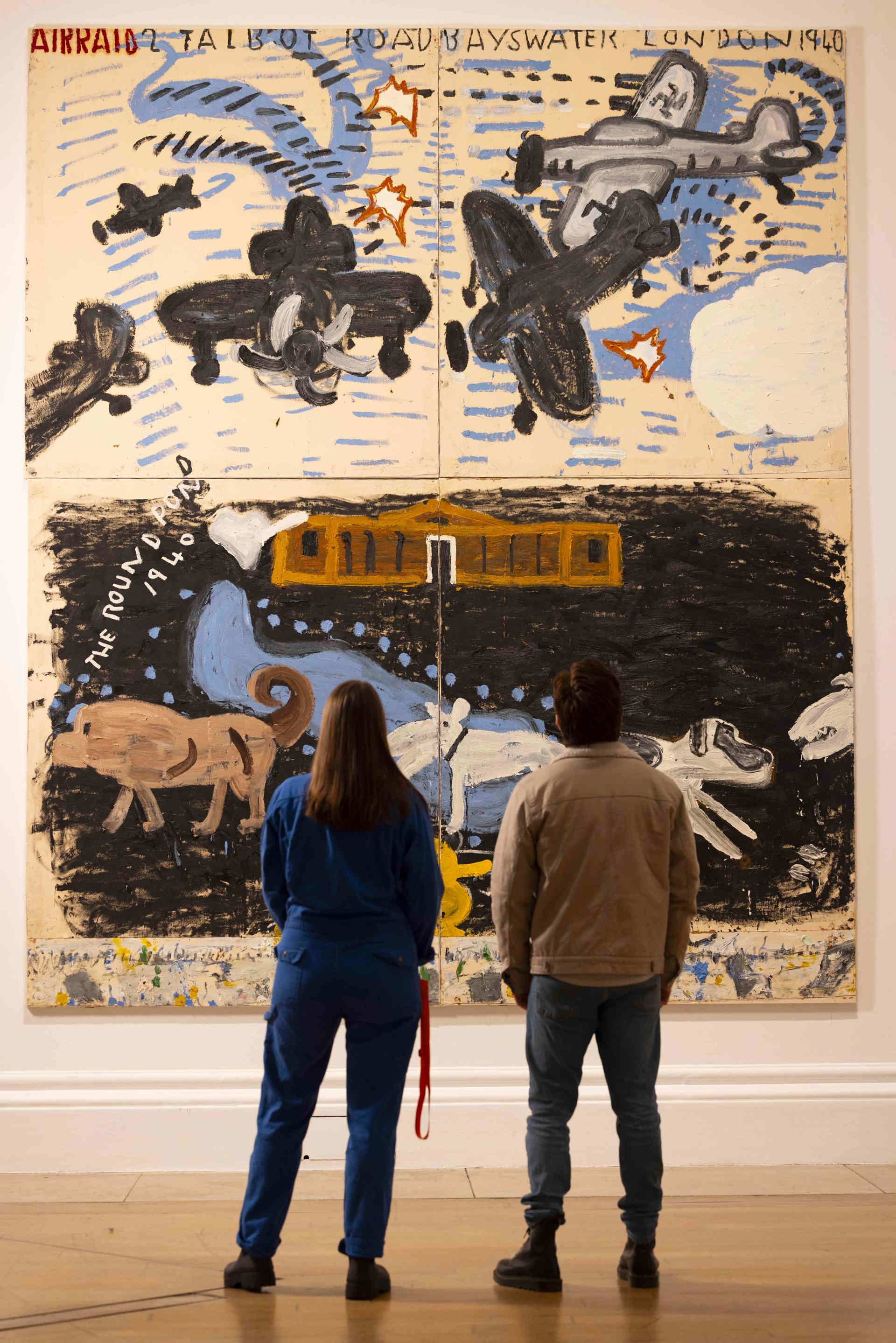 Una veduta della mostra «Rose Wylie: the Picture Comes First» alla Royal Academy of Arts, Londra, nell’immagine «Park Dogs & Air Raid», 2017, collezione privata. Foto © Royal Academy of Arts, Londra / David Parry. © Rose Wylie
