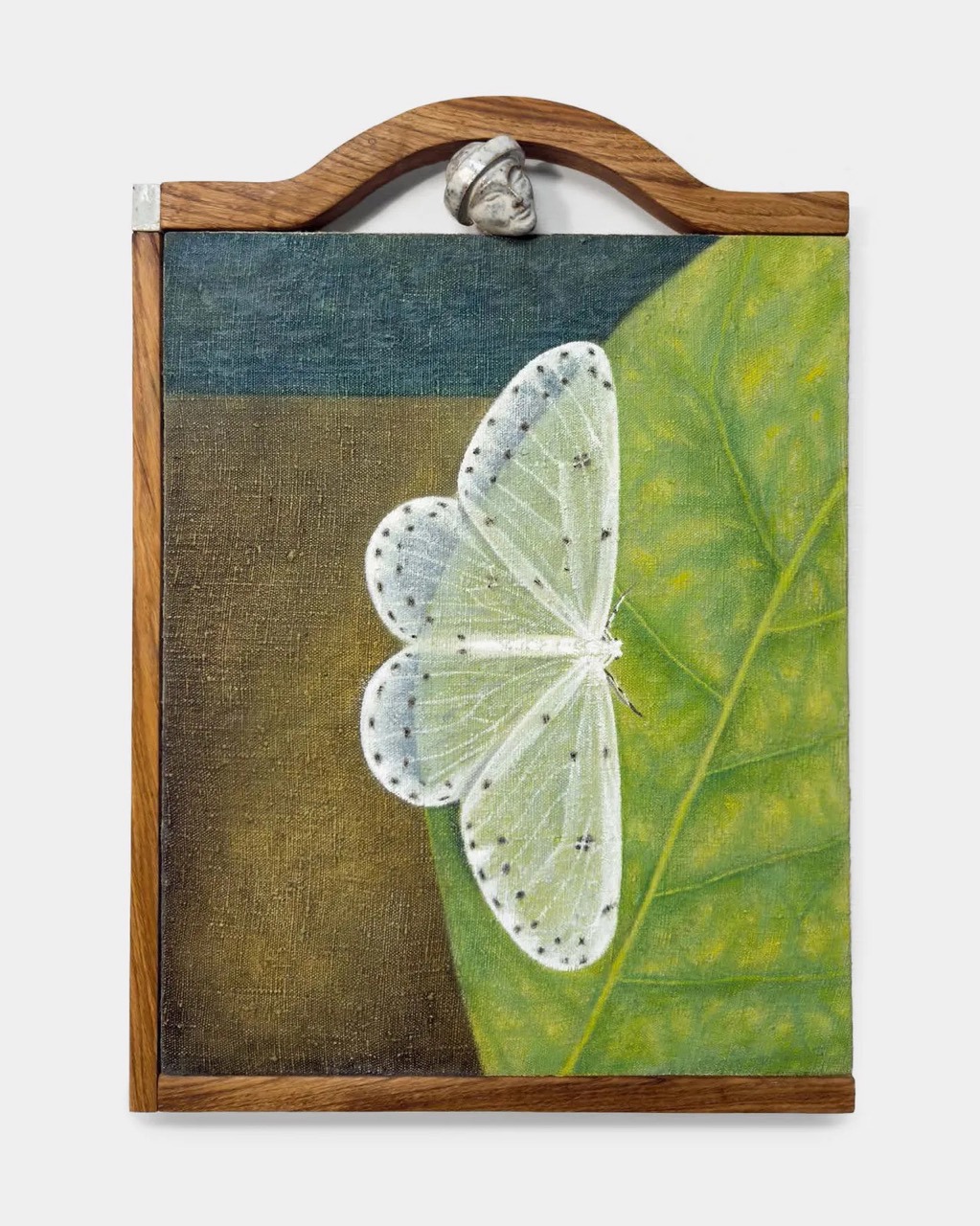 La ricerca di Sinigaglia (1989) si sviluppa invece attraverso il tempo della materia: pittura, legno inciso e ceramica dialogano in superfici stratificate da cui l’immagine affiora lentamente. In lavori come «Datura» (2026) e «Veglie e Riposi» (2026), la forma si colloca in un territorio sospeso tra figurazione e astrazione.