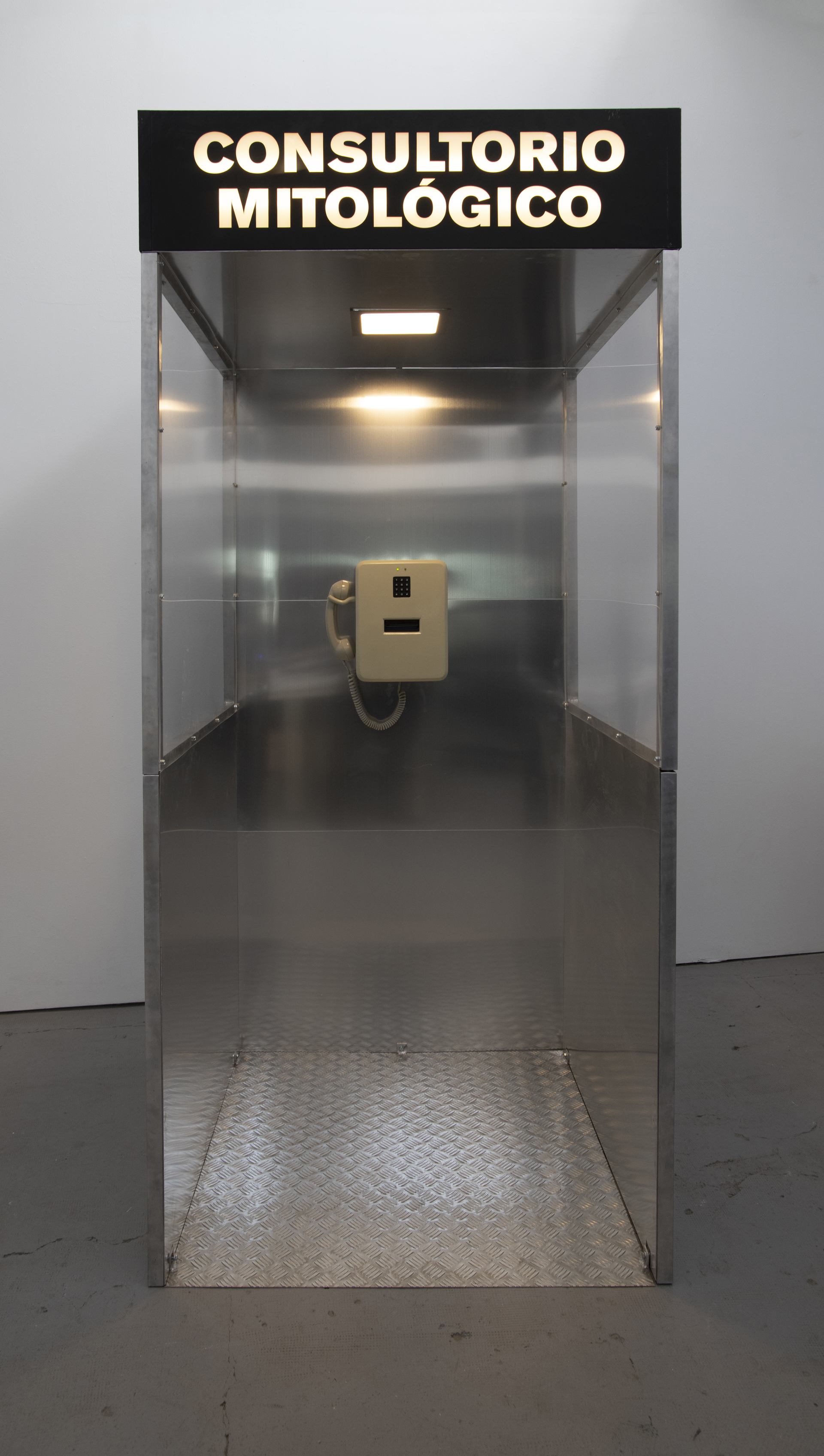 Leggi i suoi articoli«Consultorio mitologico», annuncia l’insegna e la sua fredda luce bianca pervade uno spazio vagamente inquietante, un ibrido tra una cabina telefonica e una macchina del tempo, con un’estetica da film di fantascienza anni Settanta. Al suo interno un apparato vintage a metà tra un vecchio telefono e un fax attende i visitatori per rispondere alle loro domande più intime e profonde attraverso i miti del passato e del presente.