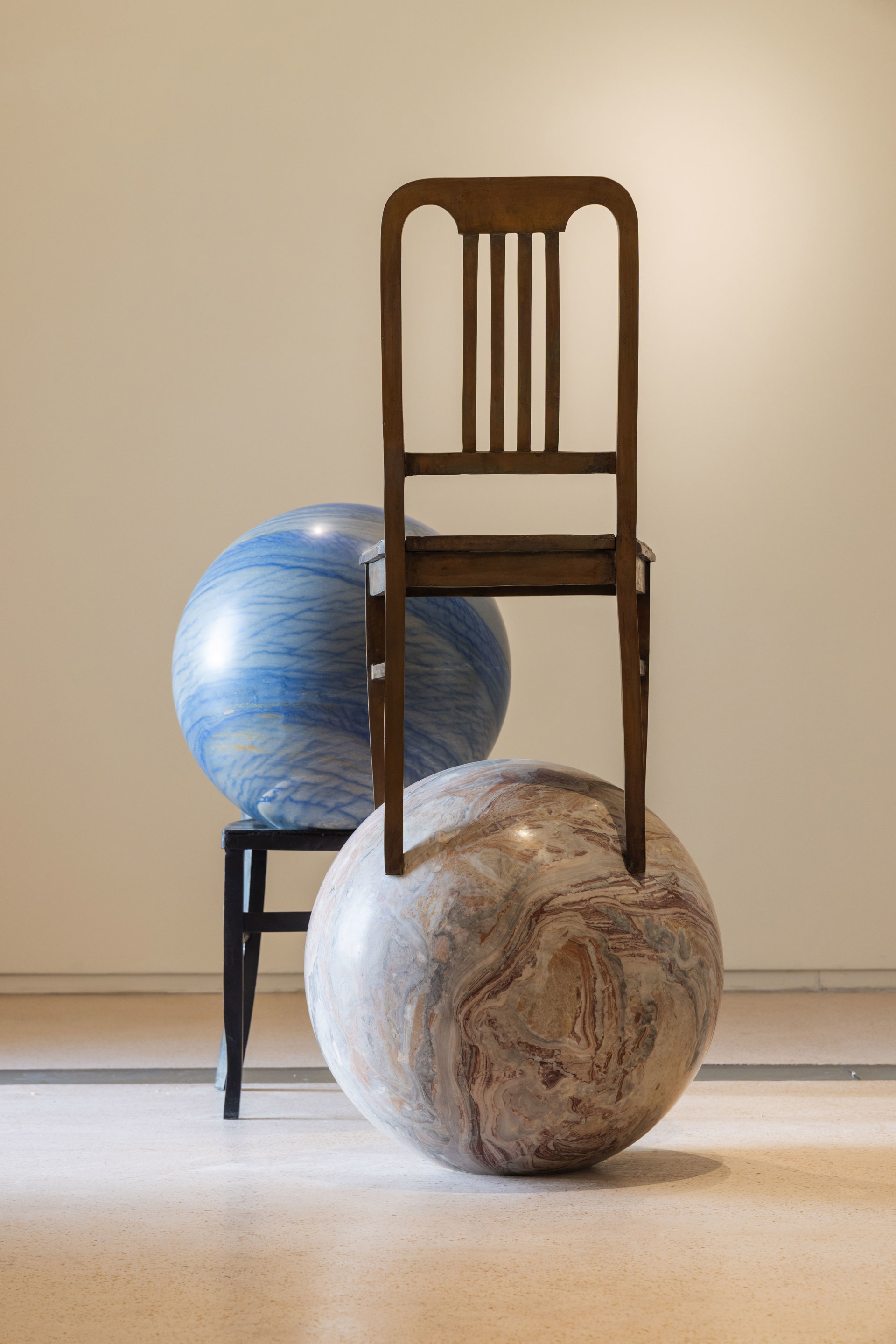 Ma, ci tiene a sottolineare l’artista, «questa mostra è anche una riflessione sulla precarietà del potere a cui è dedicata la scultura installazione all’ingresso». Titolo «Uranus e Jupiter»: due sedie da cucina che in equilibrio instabile sfidano due sfere. Ma se altrove quest’opera simbolicamente può rimandare al confronto fra il tempo quotidiano e quello infinito dell’universo, qui il senso si amplia: «È l’immagine della precarietà di ogni potere, di ogni trono, di ogni sede di comando. Ci crediamo potenti ma siamo piccoli, fragili abitanti di una sfera che gira nel vuoto. In fondo è quello che insegna Roma, una città frenetica eppure immobile dove tutto si muove in un tempo fermo che appare eterno». Sic transit gloria mundi.