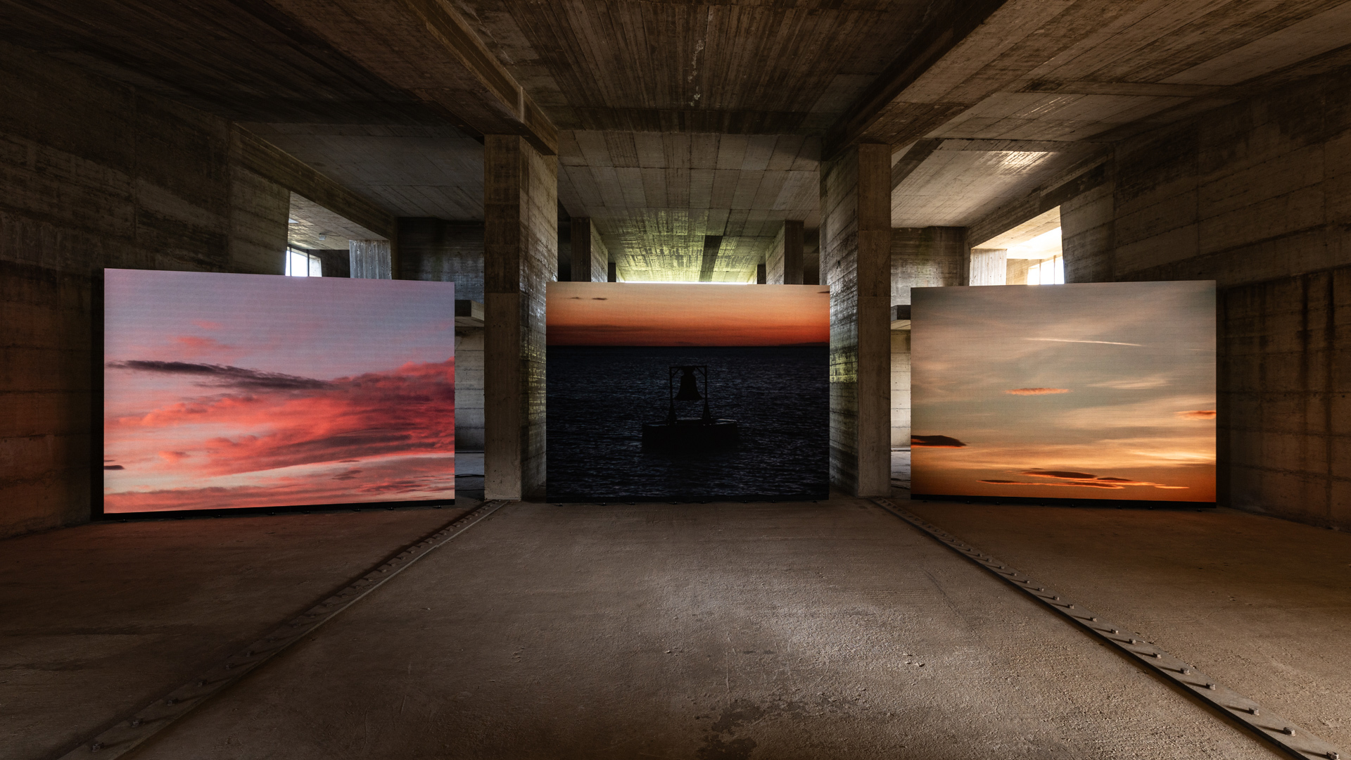 Il pubblico si riappropria così degli spazi negati e si immerge letteralmente nelle due monumentali videoinstallazioni, accolte con rigorosa grazia dall’edificio di Consagra. Si tratta delle due opere video «The Bell Tolls Upon the Waves» (2024) di Adrian Paci e «Resto» (2021) dei Masbedo, opera realizzata durante la pandemia nel Mar di Sicilia, entrambe di ambientazione marina e stranianti al punto giusto. Perfette per essere contenute dall’enigmatica «arca» di Consagra. L’opera su tre schermi di Paci è ipnotica, come recita il titolo, scandita dal rintocco di una campana «suonata» dal movimento delle onde del mare, ed è ispirata a un leggendario naufragio nelle acque del mare di Termoli, mentre «Resto» del duo dei Masbedo si affida alle note di una sonata del Settecento e all’immagine herzoghiana di una barca che solca il mare con a prua lo schermo che riproduce il video dell’organista intento a suonare. Il mare come metafora di dannazione e salvezza, incanto e pericolo, il suono come elemento che accorda gli interventi artistici, il risultato, impeccabile, è abbraccio e cura per il teatro dimenticato.