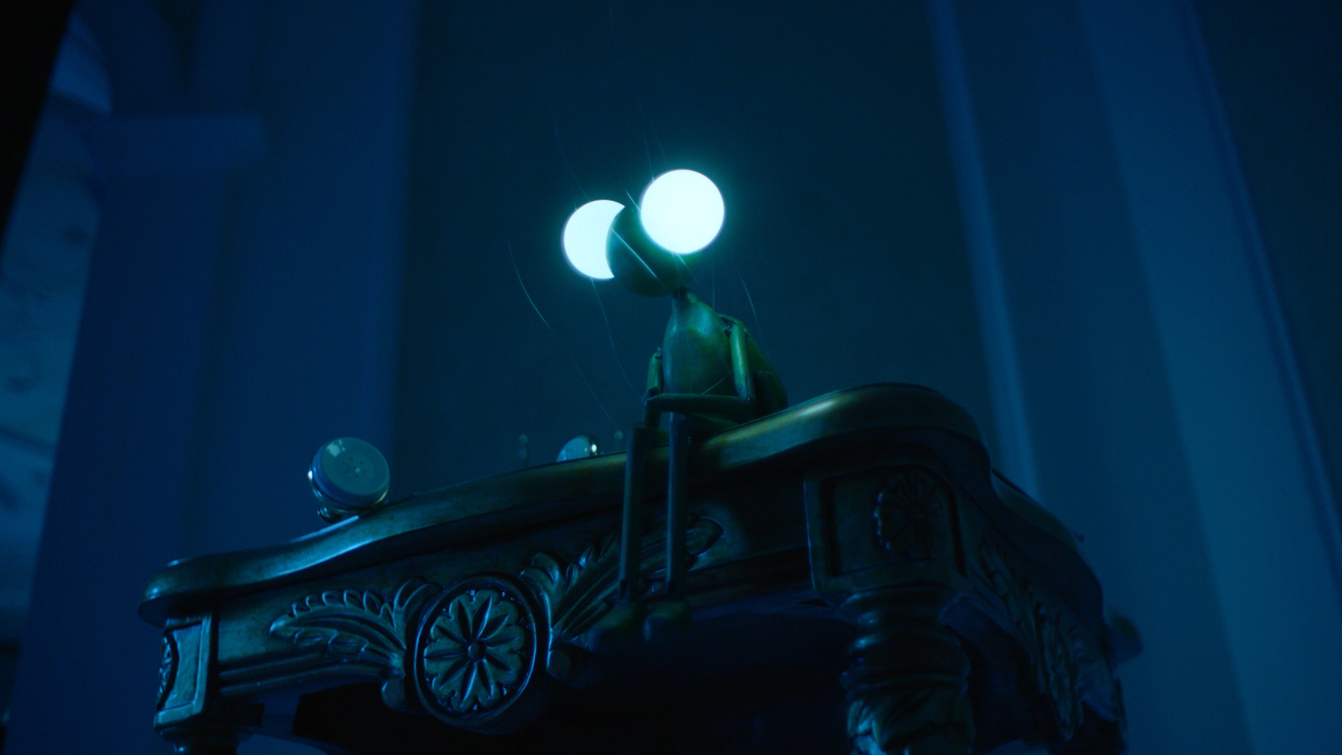 La marionetta si muove, scopre, risponde al telefono e prova a blaterare risposte a una voce che, dall’altro capo del filo, sembra in realtà volere solo parlare a sé stessa. C’è una finestra, rotonda come un oblò, e dalla finestra si vede una gigantesca porzione di Luna piena, ma il corpo celeste è in realtà così azzurrognolo che potrebbe benissimo essere la Terra: e allora dove siamo? Ancora a Beverly Hills? Oppure nello spazio? Magari in un sogno. Oppure in un incubo.