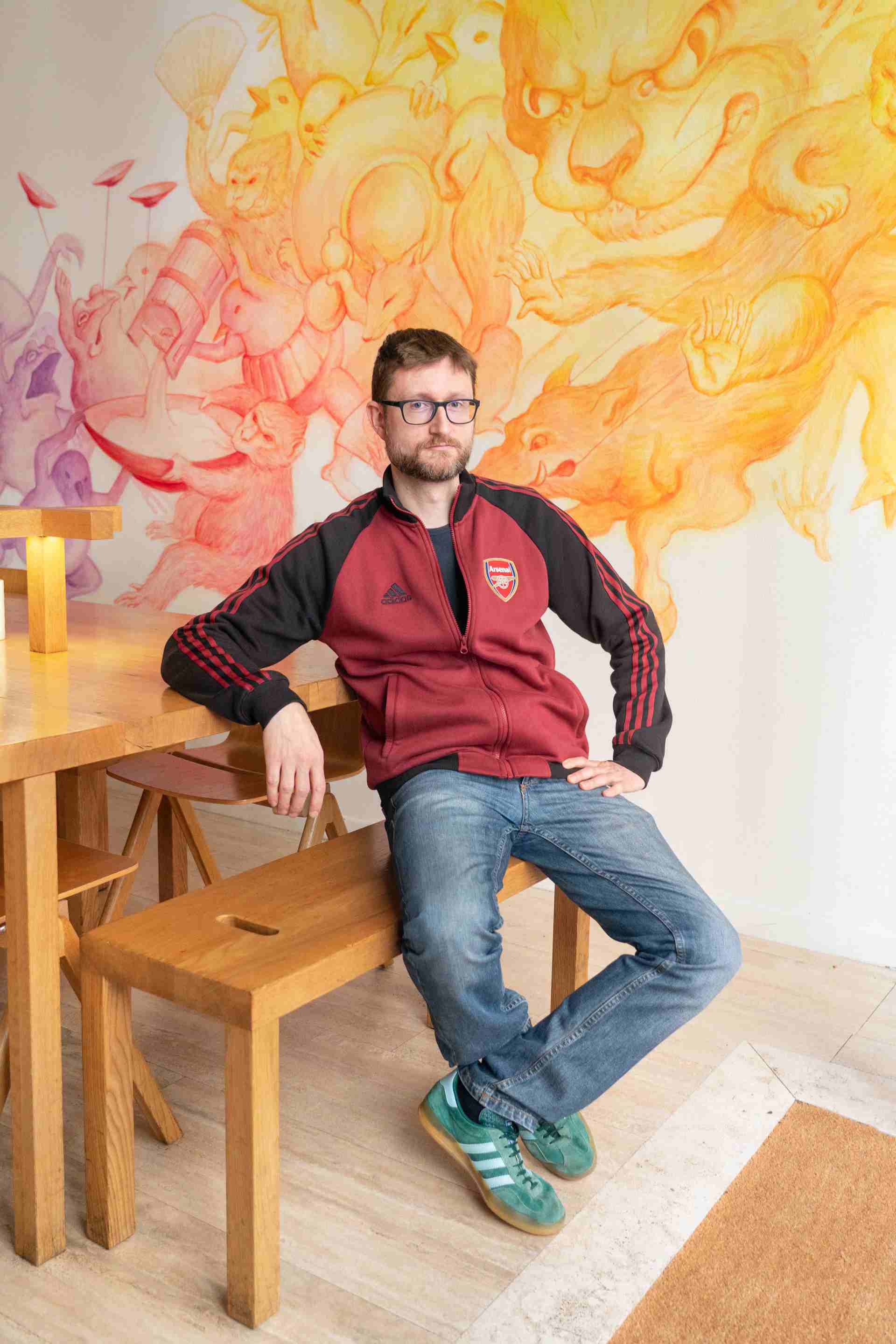 Il movimento delle figure è rafforzato dal passaggio delle tonalità cromatiche, che scorrono da campiture fredde nella zona più intima e serale del locale, a colori caldi e brillanti, riservati invece alla sala principale, conviviale e luminosa. L’ispirazione dichiarata è quella degli Emakimono, i rotoli illustrati del periodo Heian, nei quali la narrazione si dispiegava orizzontalmente scena dopo scena. Qui il principio del rotolo viene trasposto direttamente sulle pareti: una progressione di episodi che emergono secondo un’idea di racconto che si sviluppa mentre lo si percorre.