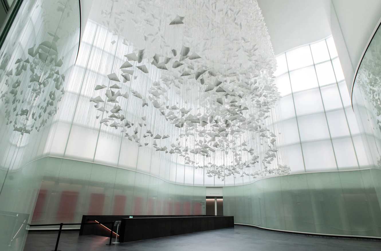 In una sala sospesa tra leggerezza e movimento, lunghe strisce di carta pendono dal soffitto, bloccando l’accesso e invitando il pubblico a ritagliarsi il proprio percorso. I visitatori assumono un ruolo attivo, definendo configurazione e significato dell’opera, che diventa un evento collettivo e mutevole.