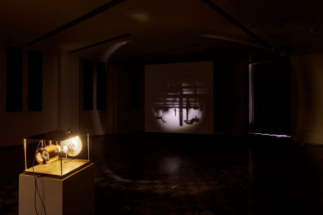 Stavolta, al secondo piano di Palazzo de’ Toschi, si entra alla mostra passando per «Lantern with clock mechanism» (2025), la grande proiezione su schermo di una cassa di orologio, che ruota continuamente sotto una teca. Un’opera apparentemente molto ermetica, ma che osservata senza sovrastrutture rivela la sua leggera e sincera profondità, secondo le parole di Tropa: «La “Lanterna” riporta all’origine della creazione delle immagini, per questo per me è una lanterna magica: è la base della fantasmagoria. Quello che mi affascina molto, inoltre, è il fatto che osserviamo un’immagine che non ha la normale identità a cui siamo abituati: si tratta di una figura non mediata. Non è una fotografia, non ha uno schermo retroilluminato a comporla; rimanda alla storia della rappresentazione. E non appena ci abituiamo all’oggetto reale qui presente, la scatola dell’orologio, ecco che esso stesso scompare dalla nostra attenzione man mano che il nostro sguardo si lascia attrarre da questa camera oscura così elementare».