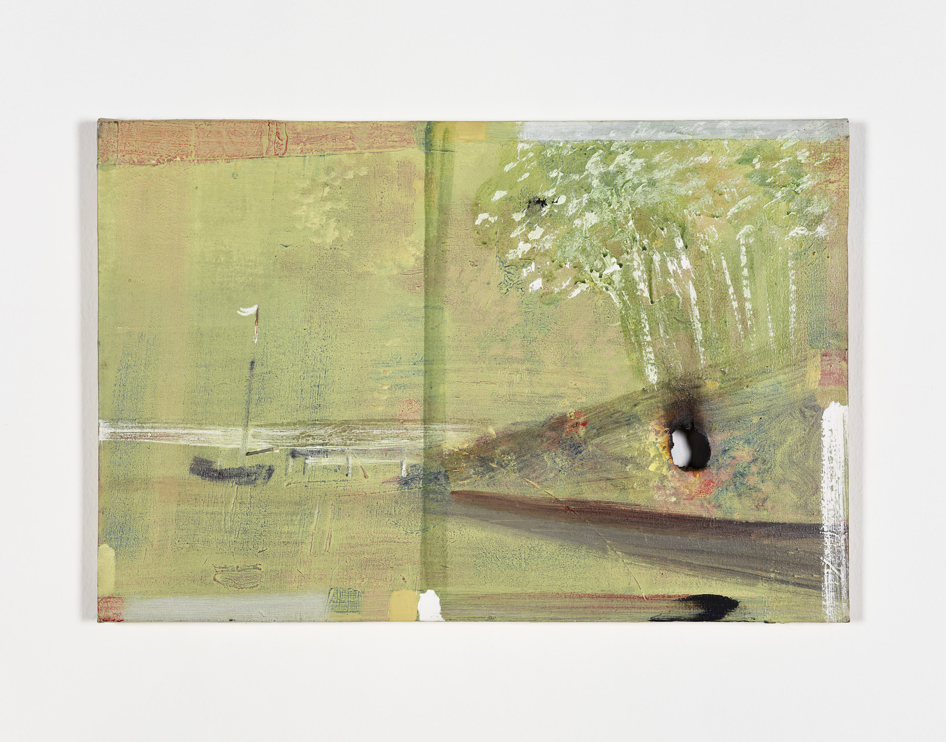 Per sfuggire all’imperativo del rinnovamento, l’autore si affida poi a un processo creativo che si distende nel tempo, e così facendo lo inganna. Lo stesso titolo della mostra, «See Through», allude a questa dinamica giocando con l’ambiguità della lingua inglese. Da un lato, il «guardare attraverso» richiama la trasparenza fisica della pittura mentre dall'altro evoca l'espressione del «portare a compimento», suggerendo un infinitezza legata alla natura dei lavori esposti. E se l’opera non è conclusa, allora non può invecchiare e il suo tempo potrebbe non finire mai. Per stressarne il carattere «altro», lontano dal suo controllo, James descrive il suo lavoro come un modo per far «viaggiare nel tempo» i dipinti, creando una sorta di ipercoscienza visiva che unisce l'artista e l'osservatore in uno stato di veglia e, al contempo, di trance. Indossata questa lente, la mostra diventa un dispositivo di opere interconnesse, aperte, sia in loro stesse che nel rapporto reciproco. In «Couples» (2026), un cipresso sembra galleggiare su una linea dell'orizzonte che, a un’analisi più attenta, si rivela essere una giuntura fisica della tela. Lo stesso accade in «Piano» (2025-2026), dove la scena d'interno viene tagliata da un intervento materico che riporta la pittura a una dimensione artigianale e terrena. James usa tagli, buchi, cenere e persino modellini di edifici per scardinare le convenzioni del genere pittorico. Sul bilico tra l’ancora materiale che le forma e l’immagine lirica che rappresentano, le opere di James restano sospese in una bolla di indeterminatezza che ne estendono la vita fintanto che nessuno, sfiorandola, ne scoppi l’incanto riportandole nel mondo.