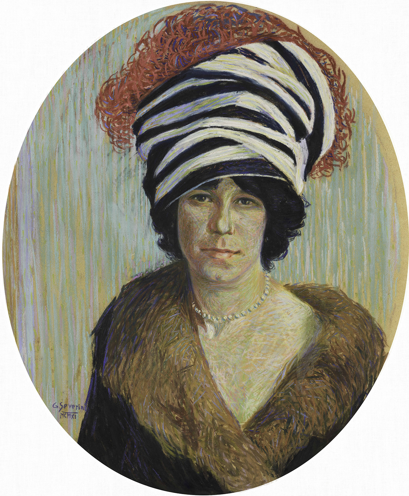 Un dialogo altrettanto intenso si apre con Gino Severini e il suo «Ritratto di Madame Costa Torro» (1911), un pastello di luminosa eleganza che cattura la grazia di una donna della Belle époque, amica del pittore e proprietaria di una boutique a Montmartre. L’opera, proveniente dalla Collezione Bocca-Giacomoni dopo una lunga storia collezionistica tra Firenze, Parigi e Venezia, mostra Severini in un momento di transizione: il realismo mondano della Parigi di inizio secolo si tinge di vibrazioni futuriste, di quella tensione dinamica che attraversa la pelliccia, il décolleté, il cielo azzurro alle spalle. Nelle nervature del colore e nelle modulazioni della luce si percepisce la stessa energia che, l’anno precedente, aveva portato Severini a firmare con Boccioni il Manifesto dei pittori futuristi. È il ritratto di un mondo al tramonto, ma anche l’alba di una nuova visione dell’arte.