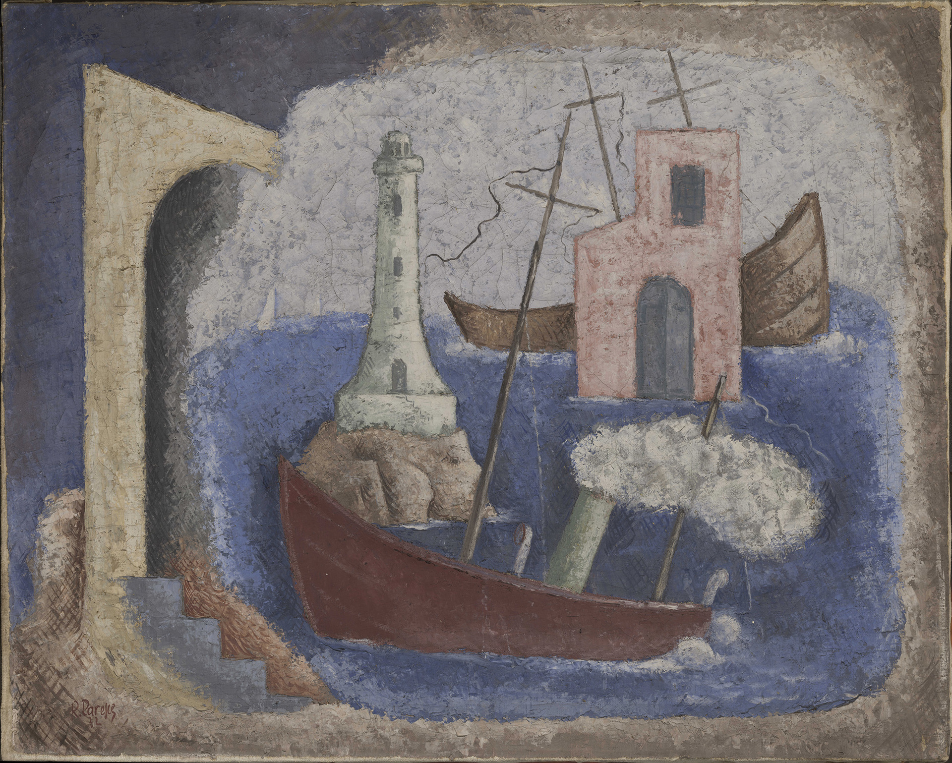 Tra i protagonisti spicca Fortunato Depero, con tre opere emblematiche del suo universo: il dinamismo teatrale dei «Balli Plastici» (1918), l’eroismo del «Gondoliere» (1924) e l’ironia ritmica dei «Somarelli Siciliani» (1925-26). Nei «Balli Plastici», la marionetta rossa che avanza sul fondale solcato da campiture di colore diventa metafora dell’energia vitale dell’arte, un’energia che prende corpo, letteralmente, nel progetto teatrale messo in scena a Roma nel 1918 con le musiche di Casella, Malipiero e Bartók. Depero, che di quell’esperienza fece un manifesto di libertà creativa, si dimostra qui perfettamente coerente con la sua visione di un’arte totale, capace di fondere gesto, colore e ritmo. Nel «Gondoliere», databile intorno al 1924 e proveniente dalla collezione di Rosetta Amadori, moglie dell’artista, il linguaggio futurista si fa allegoria esistenziale. Il barcaiolo che sfida la burrasca alla luce di un faro diventa simbolo di una lotta interiore, ma anche di un paese che, dopo la guerra, tenta di ritrovare la propria direzione. L’opera, acquistata da Giorgio Bocca dopo la morte di Amadori, vibra di tensione e poesia, con il mare viola e il cielo rosa che trasfigurano la fatica umana in mito moderno. Nei «Somarelli Siciliani», invece, l’artista trasforma la ripetizione in ritmo visivo e la fatica quotidiana in danza, raccontando, con ironia e tenerezza, un’Italia popolare e resiliente che si rialza dal dopoguerra. Gli asinelli, replicati come in un fotogramma cinematografico, incarnano quella «gioia del movimento» che Depero considerava la vera anima del Futurismo.