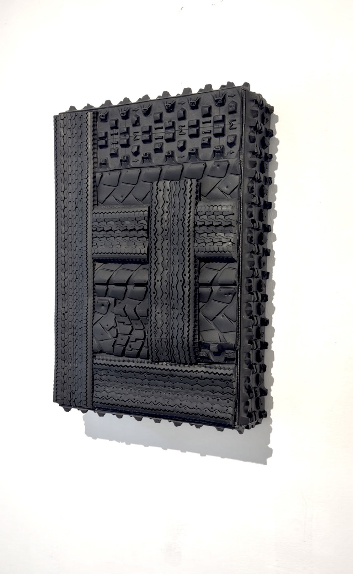 L’opera non mostra ma sottrae e, in questa sottrazione, si apre una dimensione quasi metafisica in cui la materia diventa soglia opaca del visibile, «oscura» perché eccedente rispetto alla percezione. «Wanderer (Infinite Ways)» (2002) chiude il percorso come sintesi mobile dell’intero sistema Canevari. Lo pneumatico specchiante, raddoppiato in un’immagine che ricorda l’infinito, produce una figura di transito (metafora dell’artista viaggiatore). Qui la riflessione sull’identità si dissolve in un movimento perpetuo dove l’opera attiva una condizione mentale. Infine, la serie pittorica in fieri, «Monumenti della memoria» occupa lo Spazio espositivo. Realizzati con olio motore esausto su vari supporti cartacei, questi dipinti esprimono tutto il dissenso dell’autore per la deriva comportamentale dell’uomo nei confronti dell’ambiente. La memoria, labile, corta, talvolta volutamente selettiva, appare evocata da superfici scure e da macchie che su di esse si propagano. Sono qui presenti, inoltre, opere pittoriche e scultoree realizzati con gomme di camere d’aria, pneumatici ed altri materiali tipicamente utilizzati dall’artista e che ne ripercorrono la lunga ricerca. Nel complesso, il percorso espositivo si presenta come un dispositivo curatoriale che non celebra soltanto la produzione di Canevari ma la mette in tensione, insistendo sulla dimensione terrestre, materiale, quasi archeologica della sua ricerca. Come sottolinea Canevari stesso, l’opera non è mai oggetto stabile ma memoria in transito: ciò che resta non è la forma ma l’impatto percettivo, il residuo emotivo.