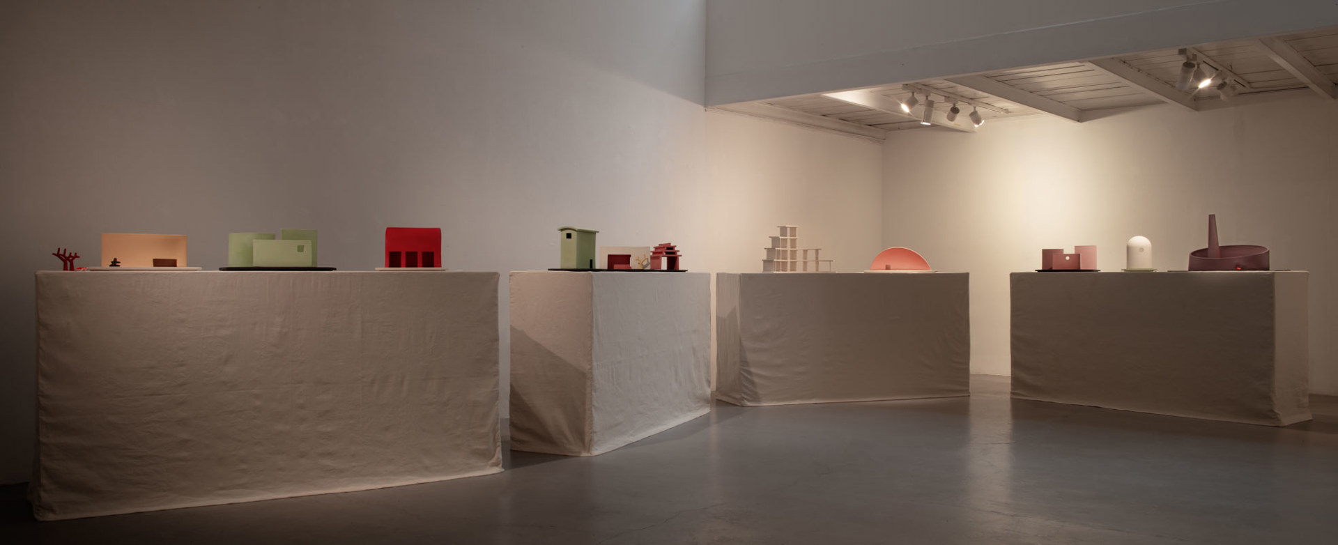 Nella mostra ci si imbatte così nel recinto ovale, violetto, di una minuscola manifattura ceramica, con l’altissima ciminiera, la casetta (minima e dorata) del guardiano e un’aiuola abitata da rose rosa, modellate a migliaia dalle donne locali e già pronte all’uso per chiunque le voglia utilizzare. O in «paesaggi» più essenziali, uno dei quali è una sorta di poetica pagoda color salmone, l’altro un piccolo edificio giallo dalla pianta a mandorla che, come tutti questi «paesaggi», può ospitare una candela, la cui luce uscirà qui dal foro sul tetto. In un altro, invece, la luce è irradiata dagli spazi che si aprono tra tre lastrine piatte e curve di un tenero rosa, in un altro ancora dalla finestrella di una casa essenziale di un pallido verde. Ma poiché la poesia non si può raccontare, l’invito è di vedere di persona questi piccoli mondi fatati, che qui sono accompagnati dagli altrettanto poetici disegni di ognuna delle sculture esposte.
