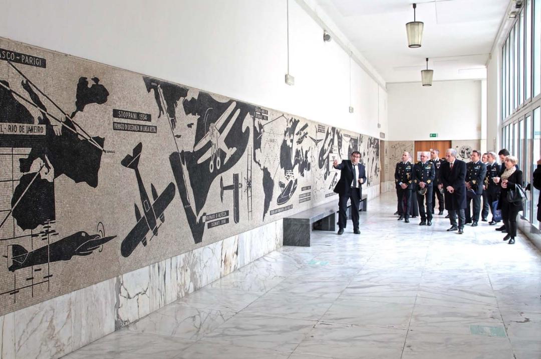 Il grande ciclo musivo, che misura 102 metri e si trova all’interno dell’ex Collegio Aeronautico, narra la storia del volo, partendo dai personaggi della mitologia greca Icaro e Fetonte, proseguendo con le macchine di Leonardo e le prime pionieristiche esperienze di decollo, per terminare con alcune campagne di guerra volute dal regime fascista