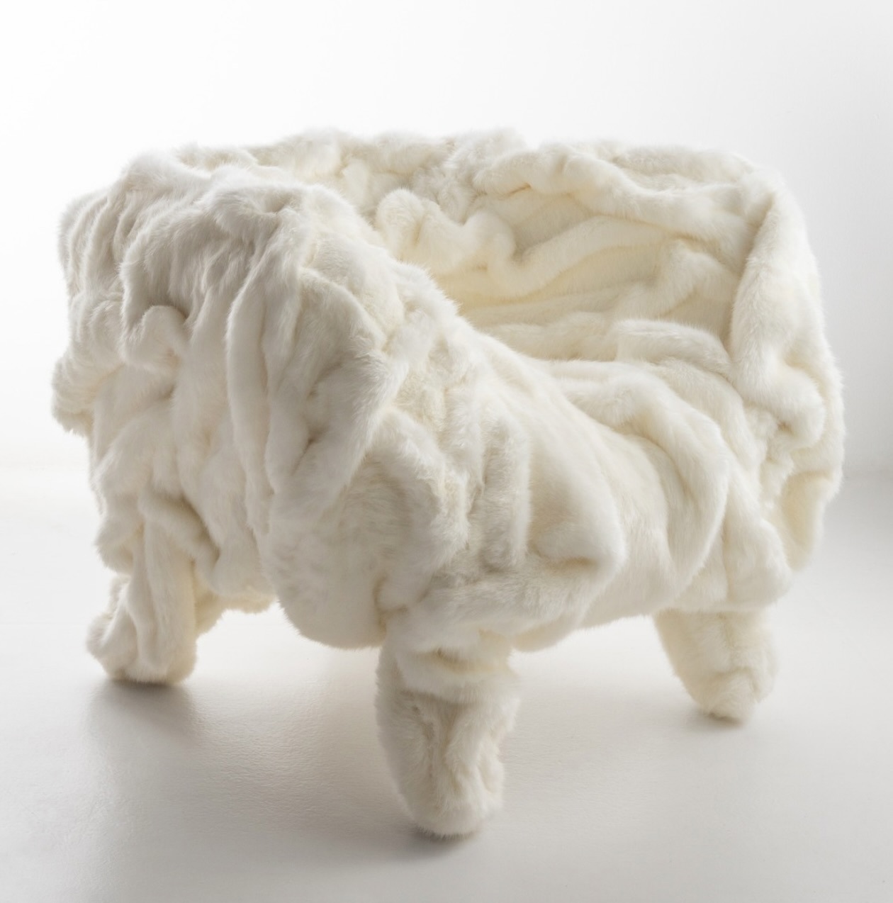 Iconica la riproposizione della Grinza dei fratelli Campana in una versione appositamente concepita per l’occasione: la Grinza White. Rivestita in eco-pelliccia bianca, la poltrona non vuole rappresentare il paesaggio alpino, ma rielaborarne alcune condizioni fisiche – il freddo, l’ingannevole sensazione di morbidezza del ghiaccio e della neve, l’idea di protezione – traducendole in un’esperienza sensoriale. La struttura irregolare e piegata, che caratterizza il progetto originario, mantiene la propria tensione formale irrisolta: non è una presenza rassicurante, non è un’icona levigata, ma una forma che conserva tracce di tensione e instabilità. Accanto alla Grinza, altri arredi storici di Edra vengono inseriti nello spazio senza gerarchie decorative, contribuendo a costruire un ambiente in cui l’oggetto non è mai isolato, ma sempre in relazione. Il Pack, divano trasformabile di Francesco Binfaré, porta l’idea stessa di arredo su un piano figurativo e narrativo, mentre le Getsuen Chairs di Masanori Umeda, sedute-scultura ispirate alla forma di un fiore stilizzato, con petali sovradimensionati, colori netti e una struttura che occupa lo spazio in modo espansivo, interrompono qualsiasi pretesa di neutralità funzionale, imponendo una presenza formale che obbliga lo spazio a riorganizzarsi attorno all’oggetto.
