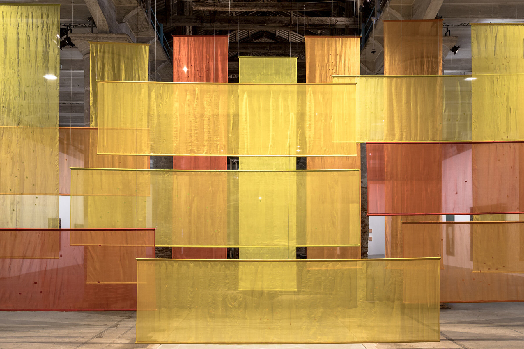 Ed è proprio da questa idea di cura e memoria che nasce il ciclo di lavori «Come, let me heal your wounds. Let me mend your broken bones» (2019–2024), in cui Awartani affronta due nodi centrali della nostra epoca: sostenibilità e distruzione culturale. I tessuti, di seta tinta naturalmente nel Kerala, nel sud dell’India, sono impregnati di una moltitudine di erbe e spezie medicinali — circa cinquanta, ciascuna con una storia, un rimedio, una memoria. Ma quei tessuti sono anche feriti: tagli, strappi, buchi che segnano i luoghi di una violenza lunga, dall’Arabia Saudita allo Yemen, dalla Siria alla Tunisia. 355 ferite ricucite a mano, punto dopo punto, come atto di resistenza. Ogni rattoppo è una cicatrice: monito e memoria insieme. In un mondo che produce e distrugge con la stessa velocità, Awartani sceglie la lentezza. Lavora con tessitrici e artigiani locali, opponendo alla logica coloniale dell’industrializzazione britannica una pratica etica, ecologica e profondamente politica. «In India ho imparato il valore del rammendo, racconta. Riparare non è solo curare: è ricordare». Quel gesto lento e meditativo del cucire diventa per Awartani una forma di pensiero, un modo per ricomporre il tempo e la memoria attraverso la materia. È nella stessa logica di cura che prende forma la sua stratificazione. In ogni lavoro si leggono anni di studio e rituale: non è solo tecnica, ma linguaggio fisico, concettuale e spirituale. Luce e ombra si alternano, stabilità e precarietà si incontrano.