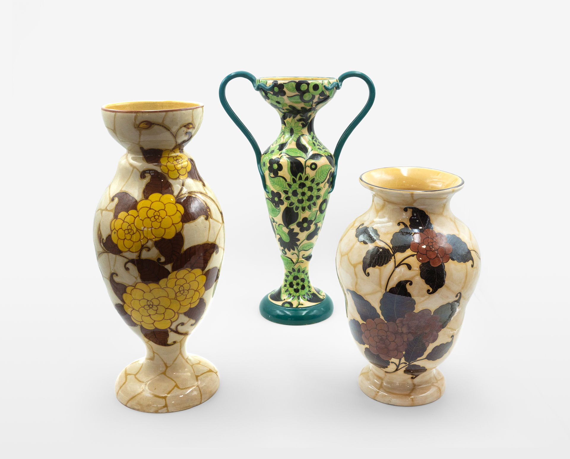 A sinistra e a destra: Vasi. Decoro floreale su mosaico, 1925-1927. Terracotta dipinta sotto cristallina. Manifattura: La Fenice, Albisola Superiore. Collezione Barbara Checcucci, Albisola Superiore. Al centro: Anfora. Decoro floreale su mosaico, 1925-27. Terracotta dipinta sotto cristallina. Manifattura: La Fenice, Albisola Superiore. Photo: Claudio Pagnacco