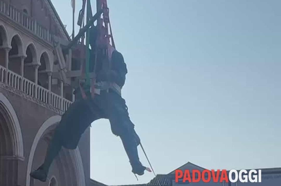 È la terza «discesa» del gruppo bronzeo dal suo collocamento sul sagrato: la prima avvenne nel mese di novembre del 1917, la seconda il primo ottobre del 1940
