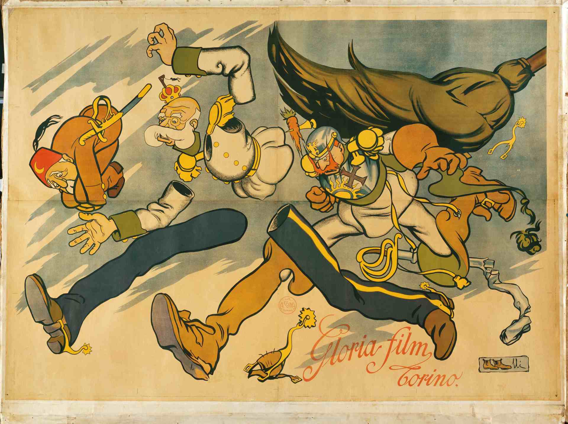 Filiberto Scarpelli Manifesto per Il sogno di Don Chisciotte di Amleto Palermi, Italia, 1915 Raffigura, durante la I Guerra Mondiale, l’imperatore di Prussia e Germania Guglielmo II (nel film “Guglielmone”) tronfio con il mondo in mano.